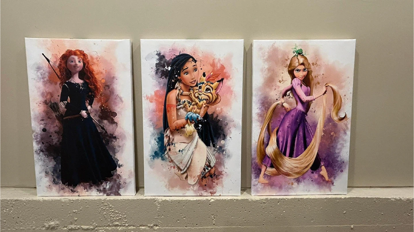 Set of three Disney princess canvas prints! Includes Merida, Pocahontas, and Rapunzel. Great for adding a touch of magic to any room. Roughly 14 x 22 inches each piece