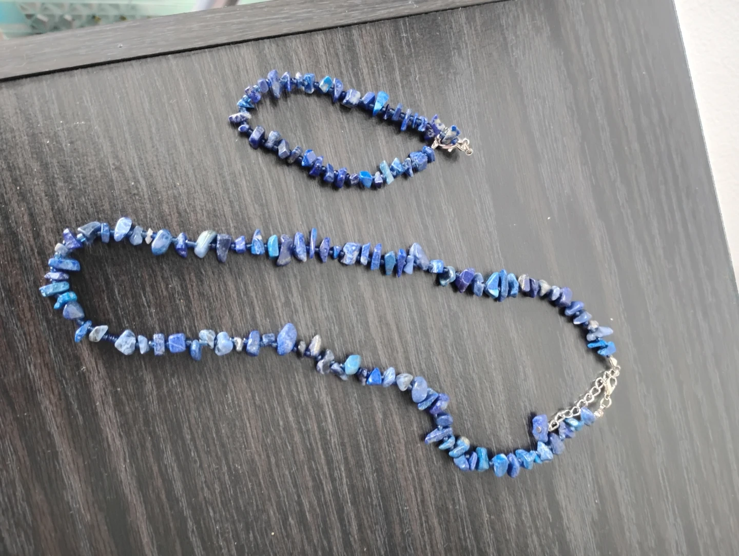 Beautiful set of a blue stone chip necklace and matching bracelet. It's made with irregular shaped blue stone chips and a silver-toned clasp. This set adds a pop of colour to any outfit!