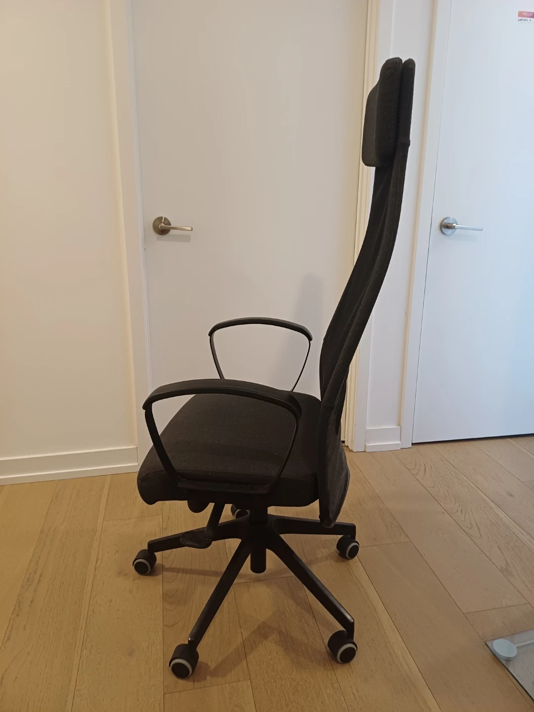 Comfortable black ergonomic office chair with a high mesh back and adjustable headrest. It features padded armrests and a five-wheel base for stability and easy movement. Perfect for long work sessions at home or in the office!