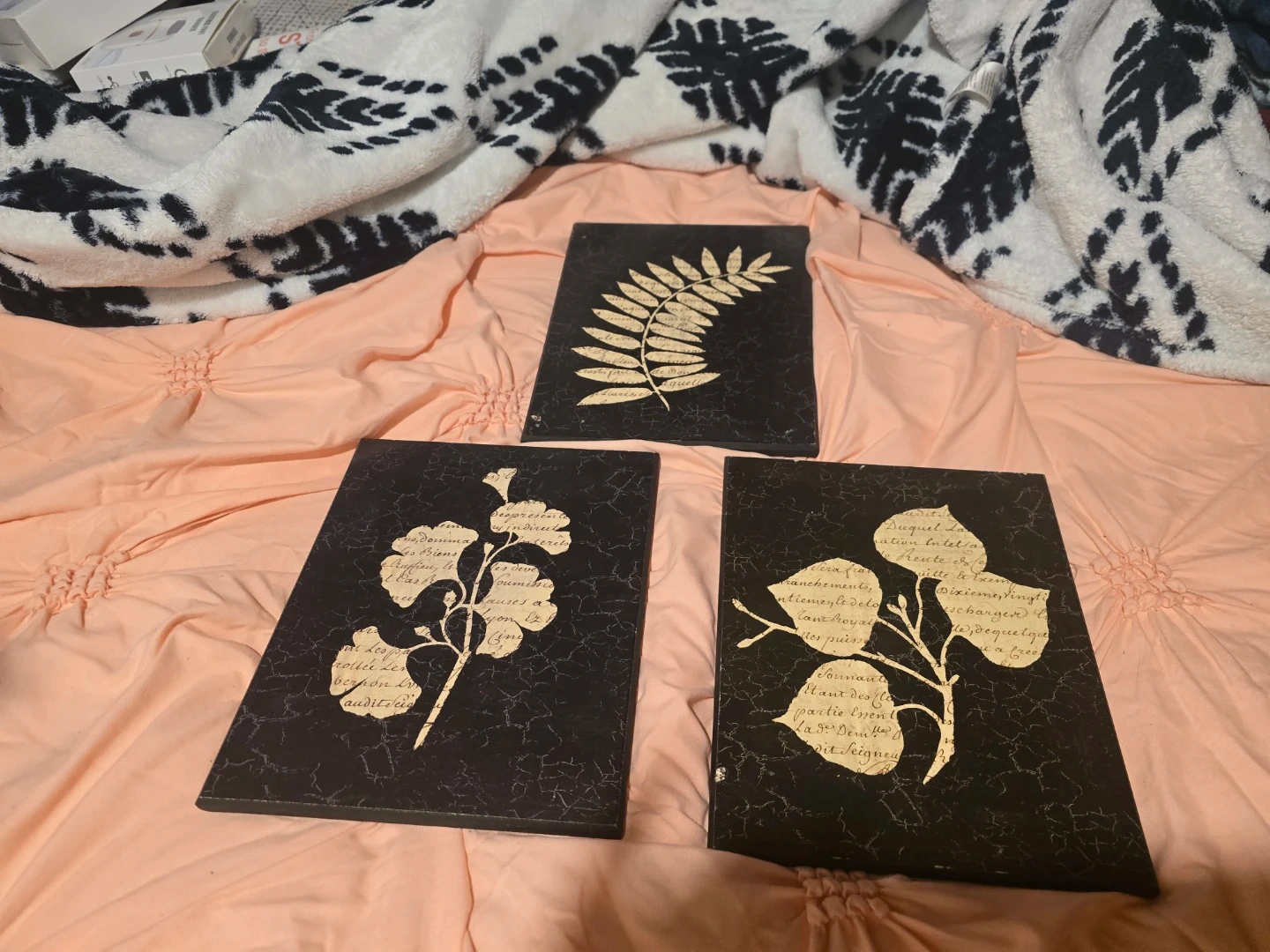 Set of three decorative art prints featuring botanical illustrations on a black textured background. Each print has a unique plant design with faint script detailing. These would add a touch of nature-inspired elegance to any room. The prints appear to be canvas or wood-mounted.