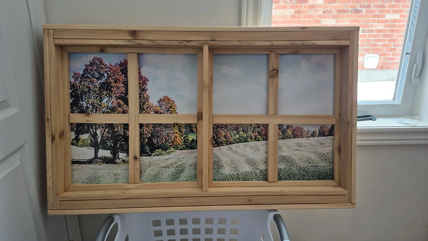 This decorative piece features a rustic wooden frame with a landscape print. It brings a touch of nature indoors without a real window. The wood appears to be cedar. It has a sliding panel design to change the view, perhaps. Measures approximately 36 inches wide and 18 inches tall.