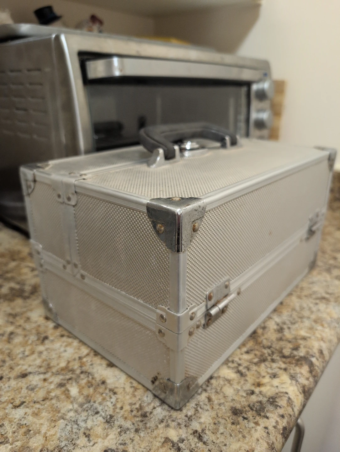 This is a retro solid silver train case with multiple compartments. It features extendable trays and a sturdy handle for portability. Perfect for organizing makeup or small accessories!