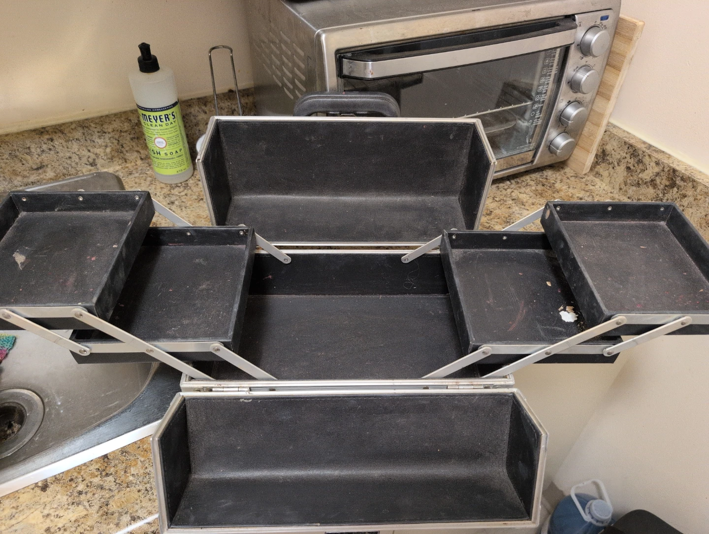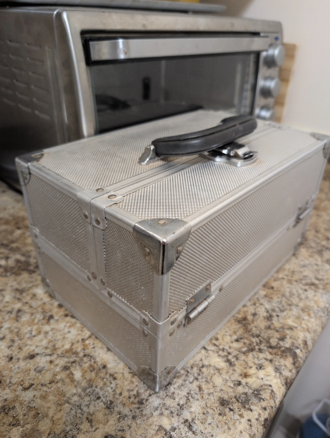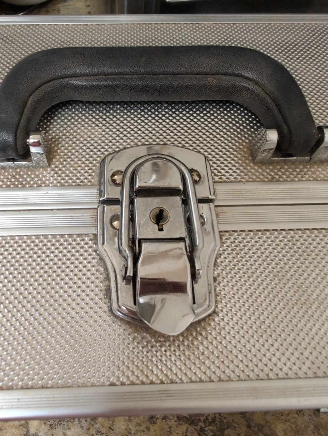 This is a retro solid silver train case with multiple compartments. It features extendable trays and a sturdy handle for portability. Perfect for organizing makeup or small accessories!