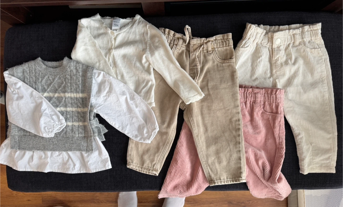 A collection of baby girl outfits including tops, bottoms, and a special "1st Birthday" outfit. Items are in sizes 9-12 months various colours, and materials such as cotton and corduroy. It's a great mix for a baby's wardrobe!
