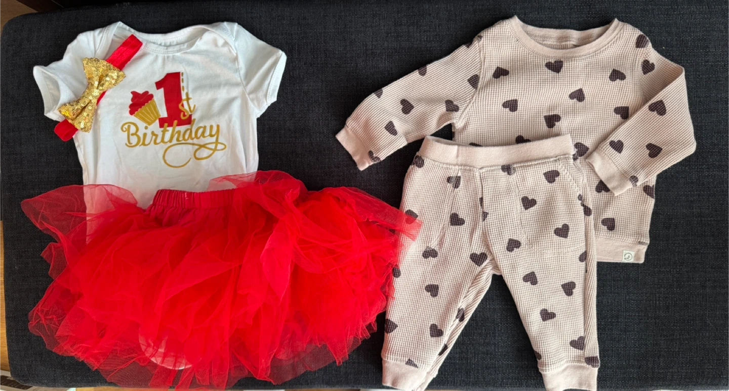 A collection of baby girl outfits including tops, bottoms, and a special "1st Birthday" outfit. Items are in sizes 9-12 months various colours, and materials such as cotton and corduroy. It's a great mix for a baby's wardrobe!