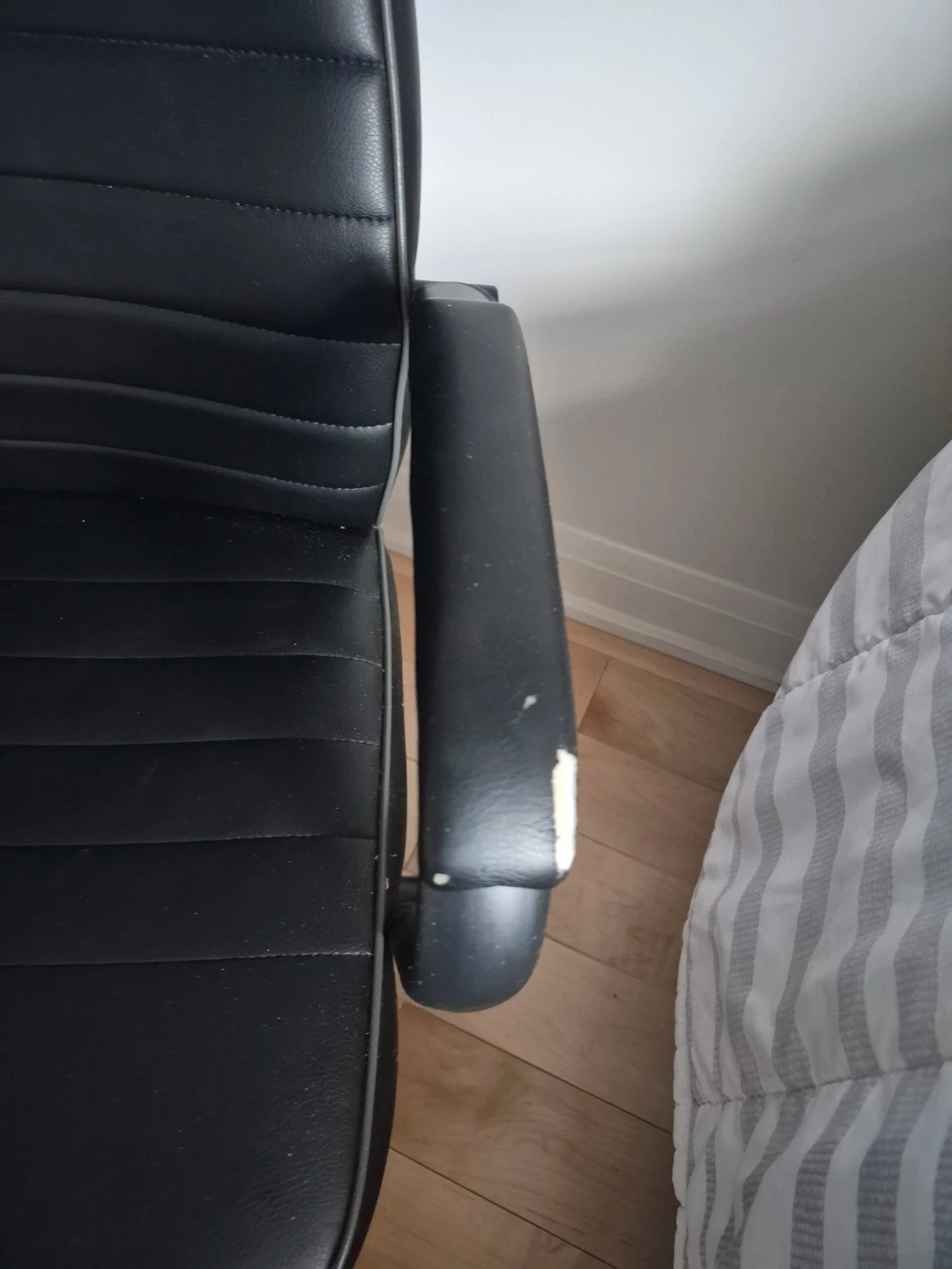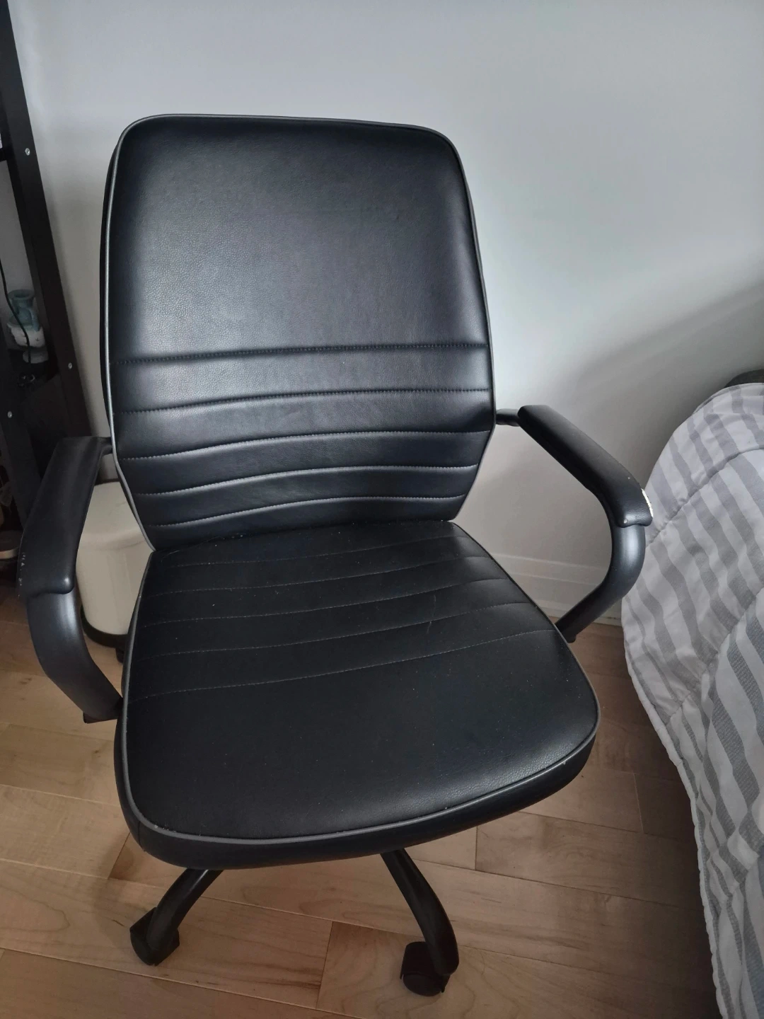 This is a black office chair with a faux leather finish. It's got some wear on the armrests, as shown in the photos. This chair would work well for a home office setup.