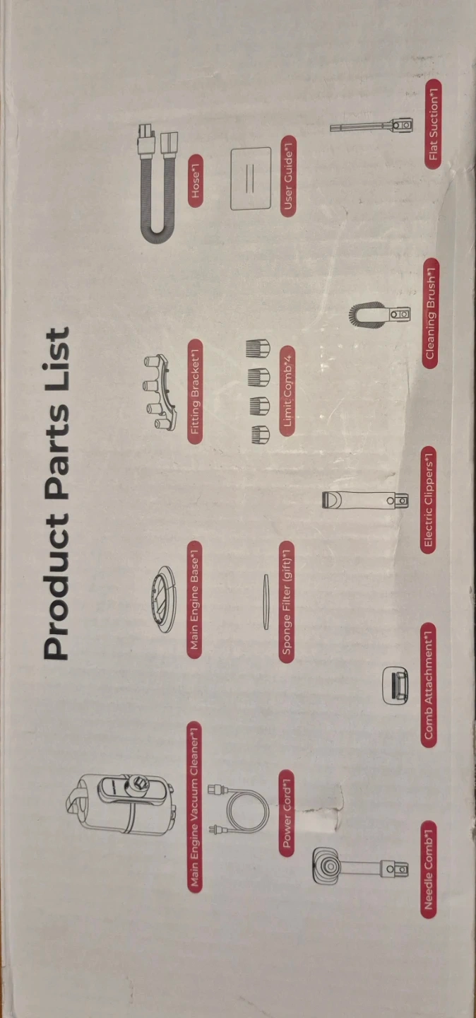It's a 2-in-1 comb with a 2.1L super-large capacity. It has powerful suction and less noise, and it's designed to use while recycling, so hair does not fall. Included in the box are the hose, user guide, flat suction, fitting bracket, limit comb, cleaning brush, main engine base, sponge filter, electric clippers, main engine vacuum cleaner, power cord, comb attachment, and needle comb