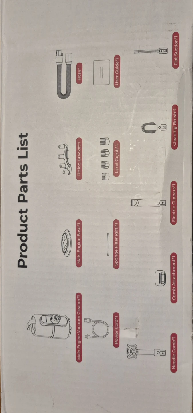 It's a 2-in-1 comb with a 2.1L super-large capacity. It has powerful suction and less noise, and it's designed to use while recycling, so hair does not fall. Included in the box are the hose, user guide, flat suction, fitting bracket, limit comb, cleaning brush, main engine base, sponge filter, electric clippers, main engine vacuum cleaner, power cord, comb attachment, and needle comb