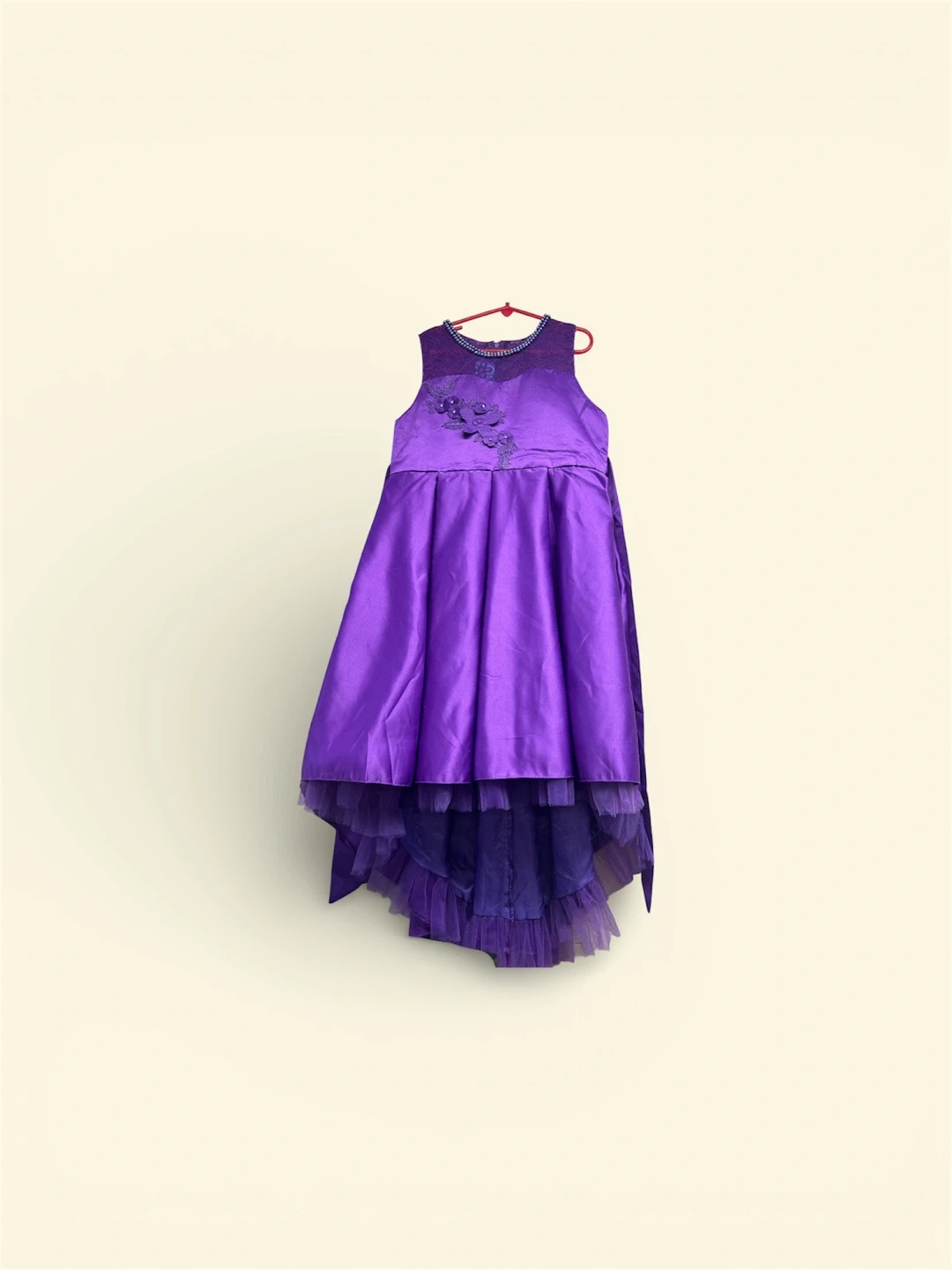 This girls' dress is a vibrant purple color. It features a satin bodice with beaded detailing and floral appliques. The skirt is layered with sheer tulle for a full, whimsical look.