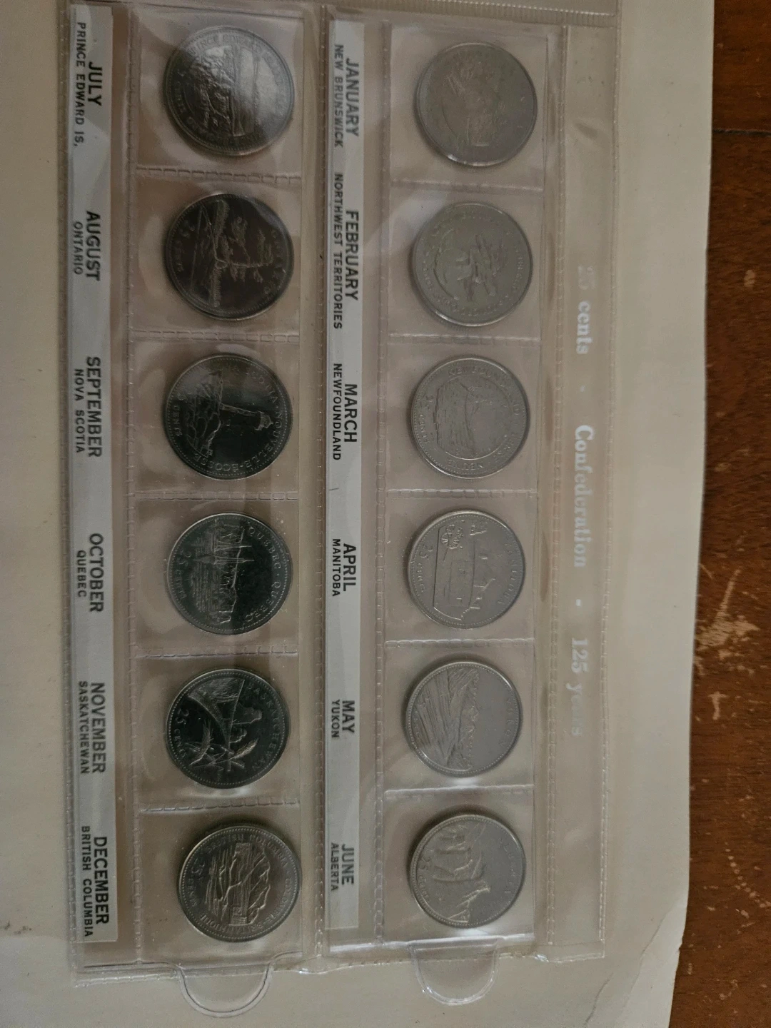 This is a collection of Canadian 25-cent coins representing each province and territory. It commemorates the 125 years of Confederation. Each coin features unique provincial or territorial imagery on one side and the effigy of Queen Elizabeth II on the other.