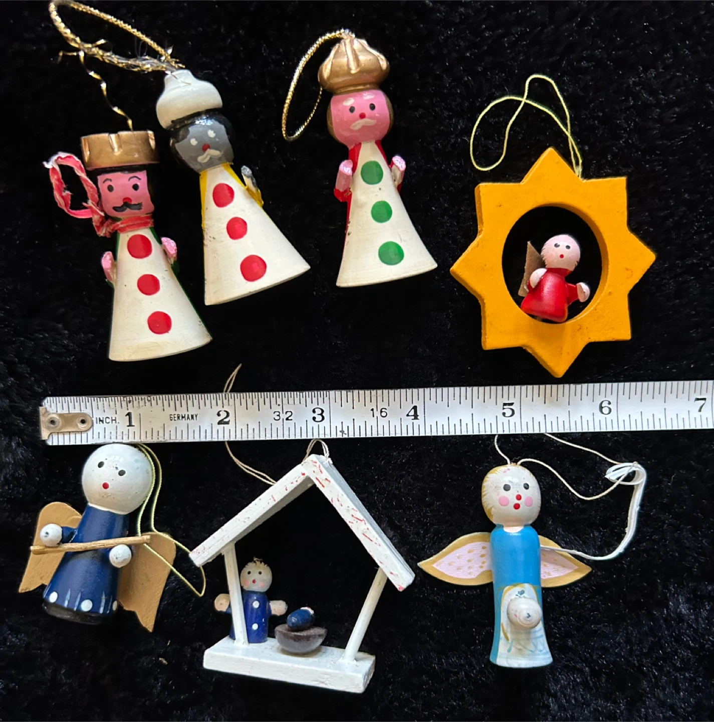 $5 Wood Vintage Wooden 7 lot Christmas Ornaments Miniature 3 wise men partial crèche handmade