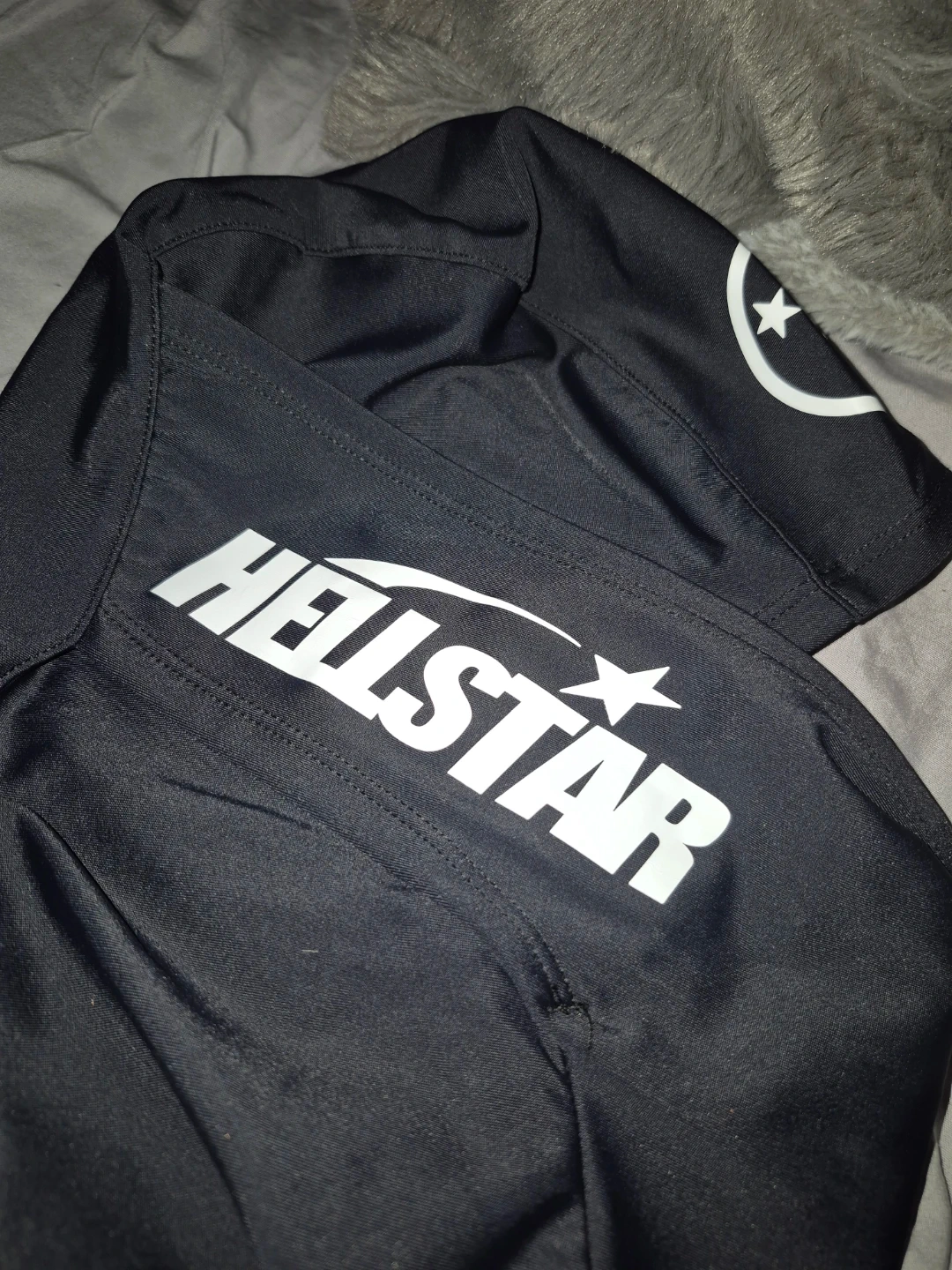 This is a black racing cap by Hellstar. It features a circular logo with a star and a profile silhouette on the front. The cap is made of a stretchy, likely synthetic material. It's designed for performance and would be suitable for racing or athletic activities.