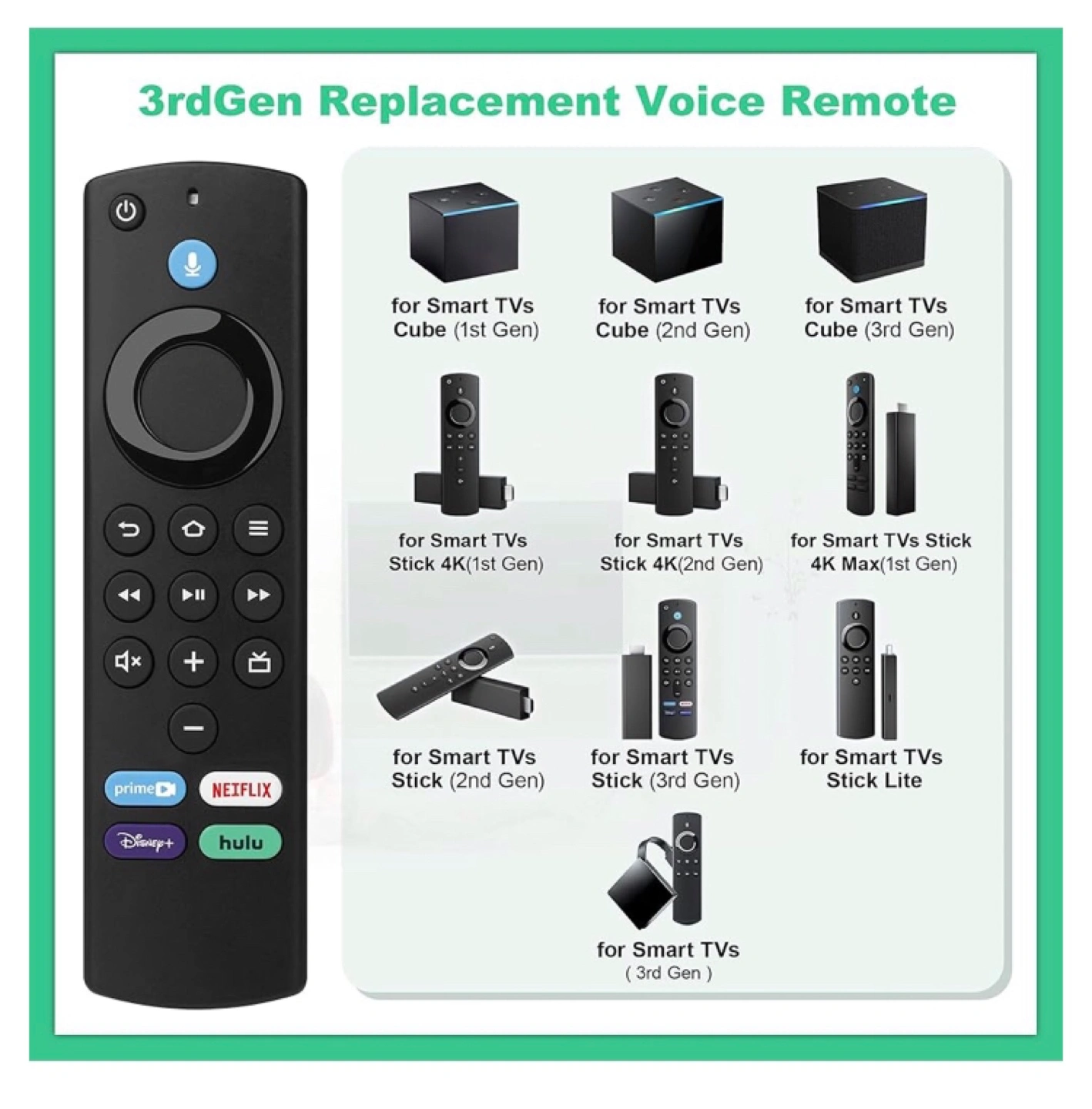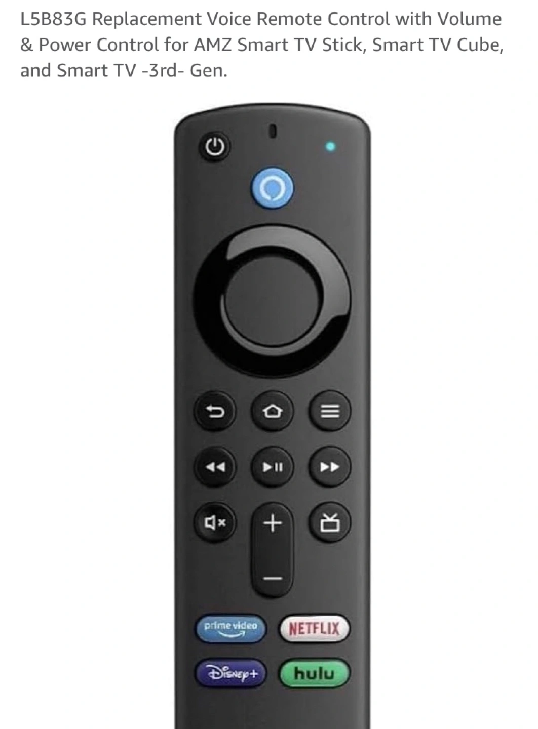 Voice remote control for Amazon Fire TV Stick. Features buttons for Netflix, Prime Video, Disney+, and Hulu. Works with voice commands and comes with volume and power control.