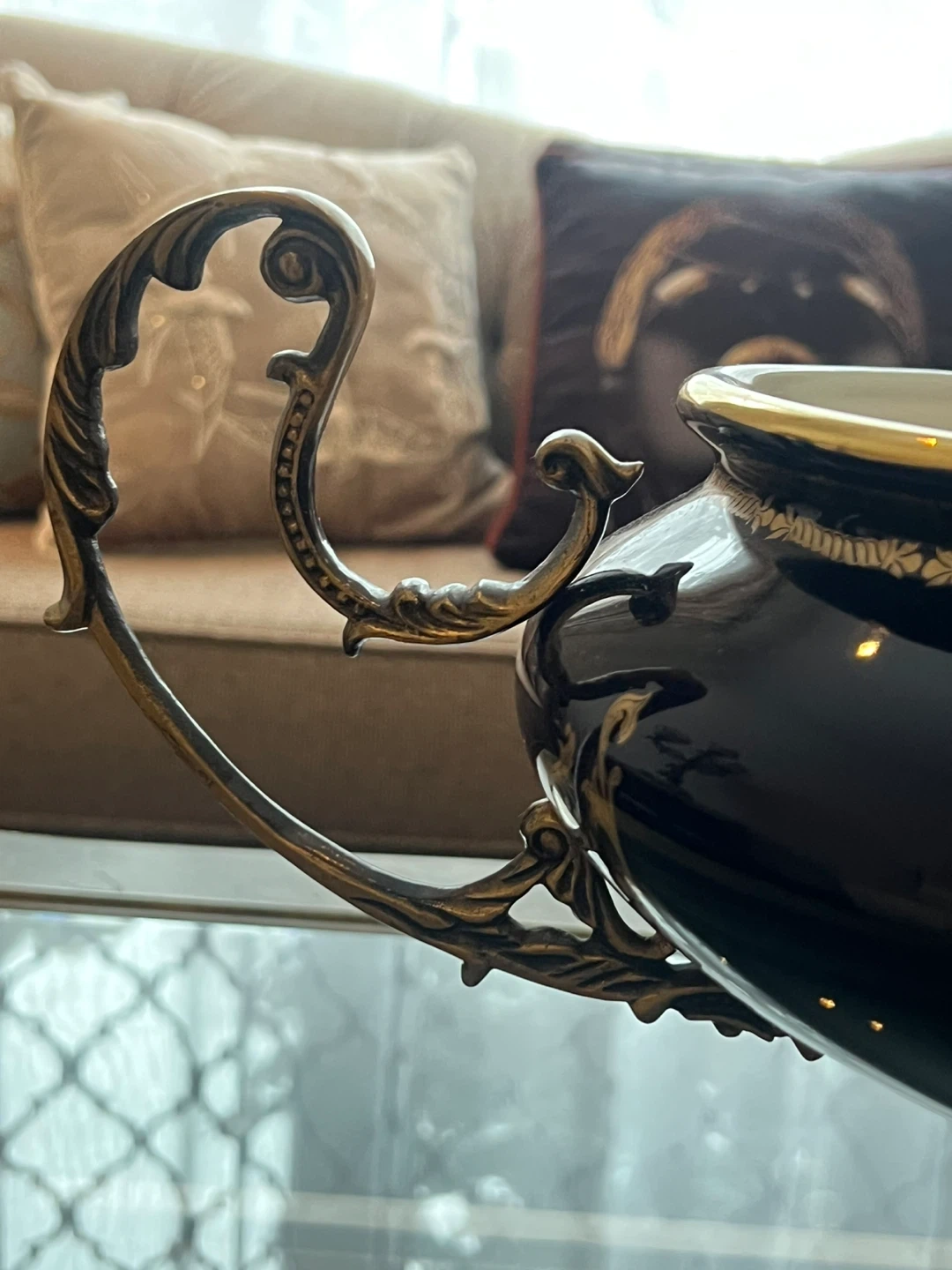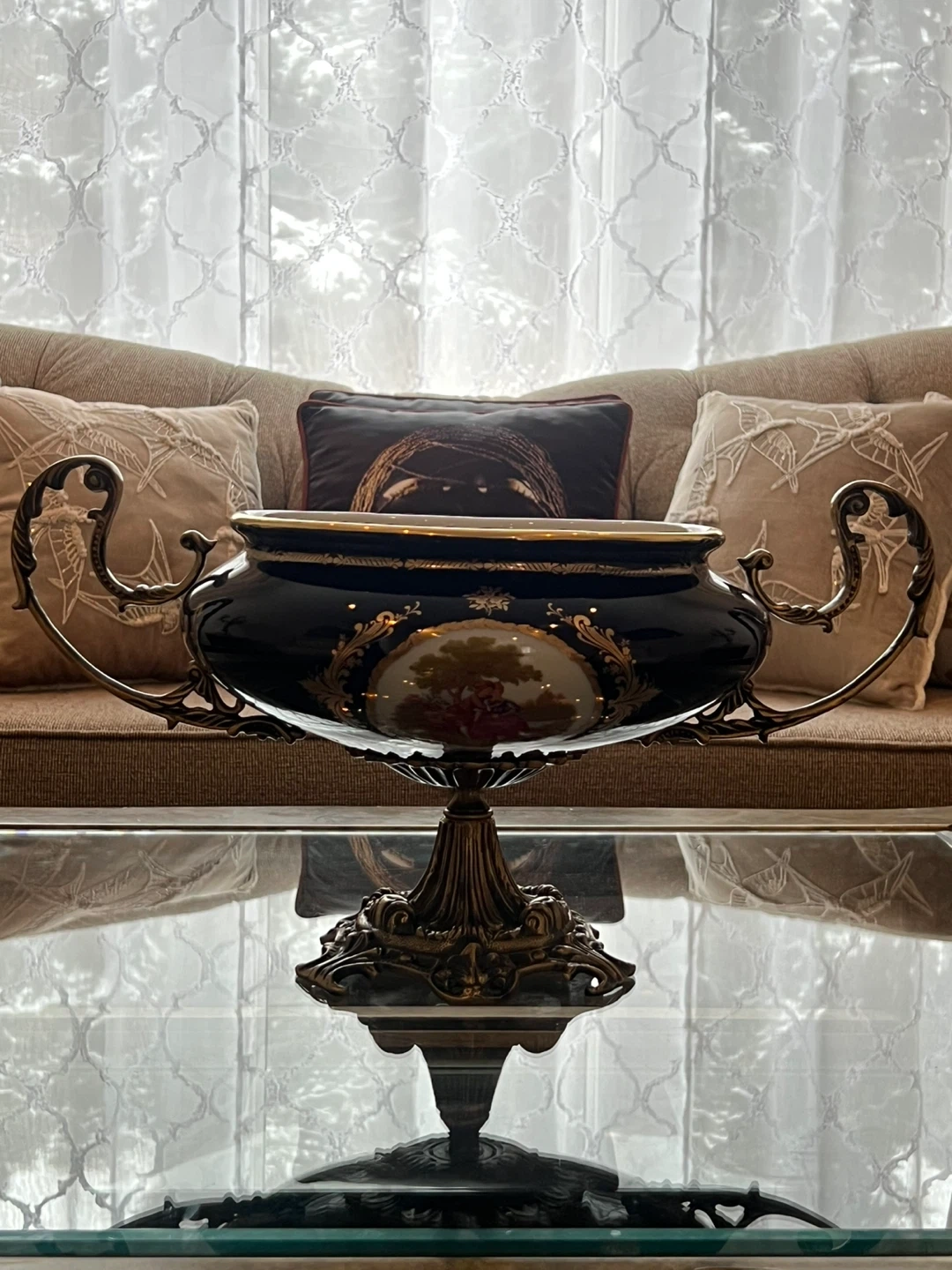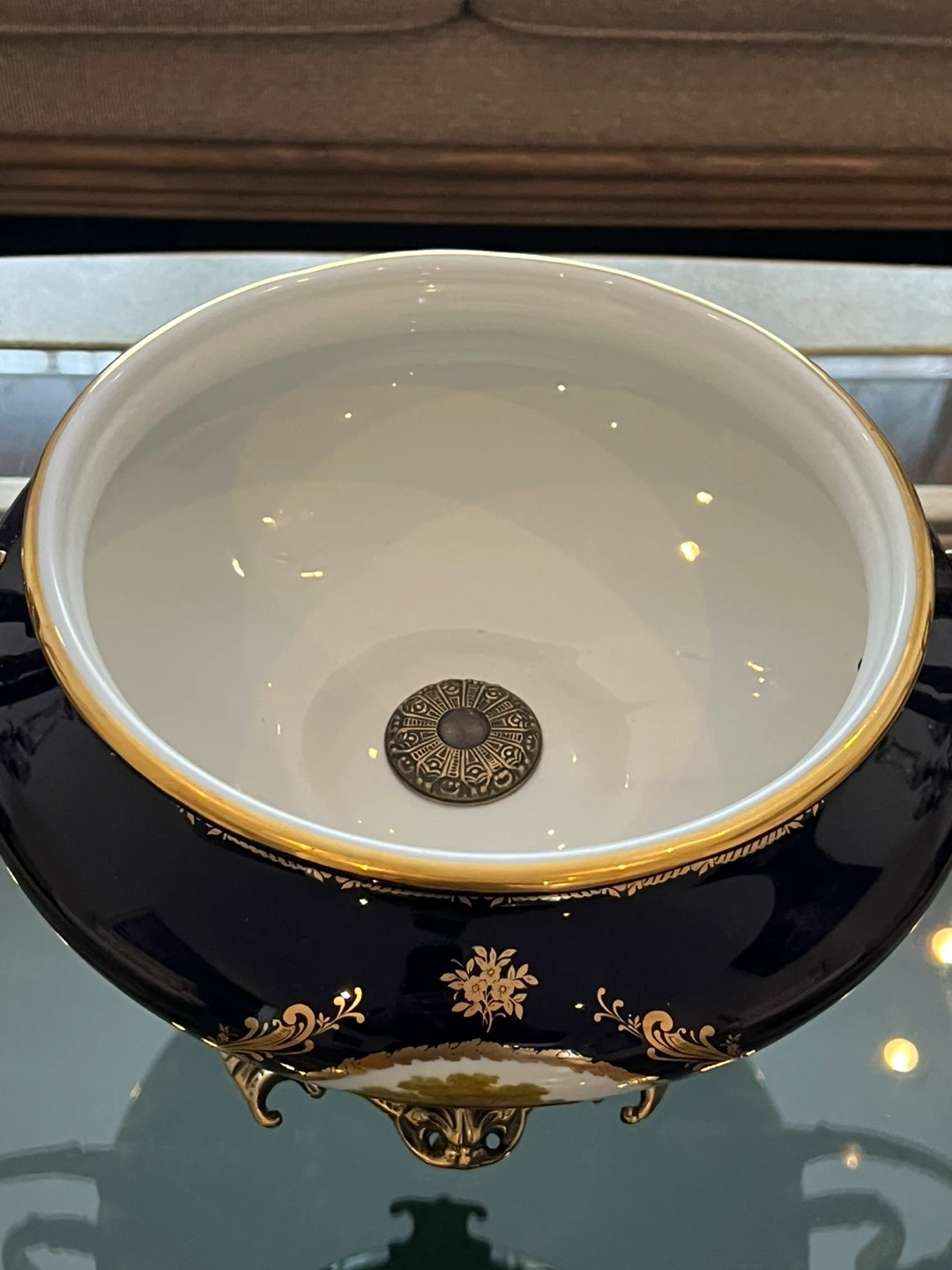 A dark blue ceramic pedestal bowl featuring ornate gold trim and a scenic painting. It has decorative metal handles and a detailed bronze-toned base. Perfect for display or as a statement piece on a table.