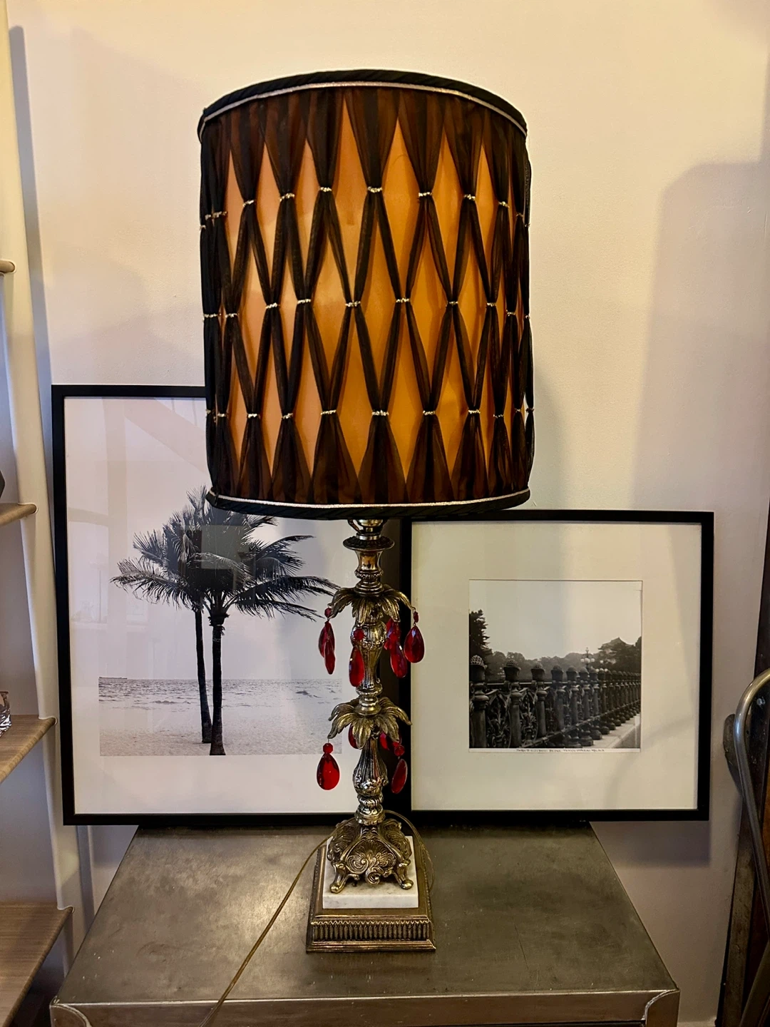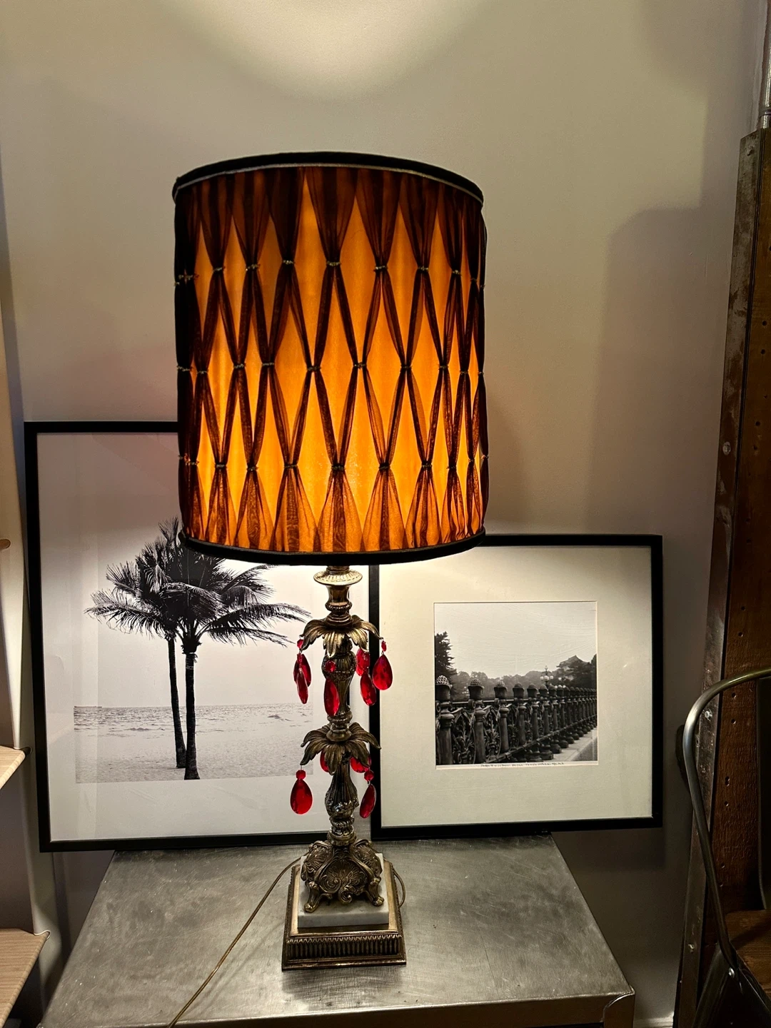 A crazy cool antique parlour lamp! Marble base with brass filigree & a simply spectacular shade that offers warm diffused light. Works great and switch has a dimmer.