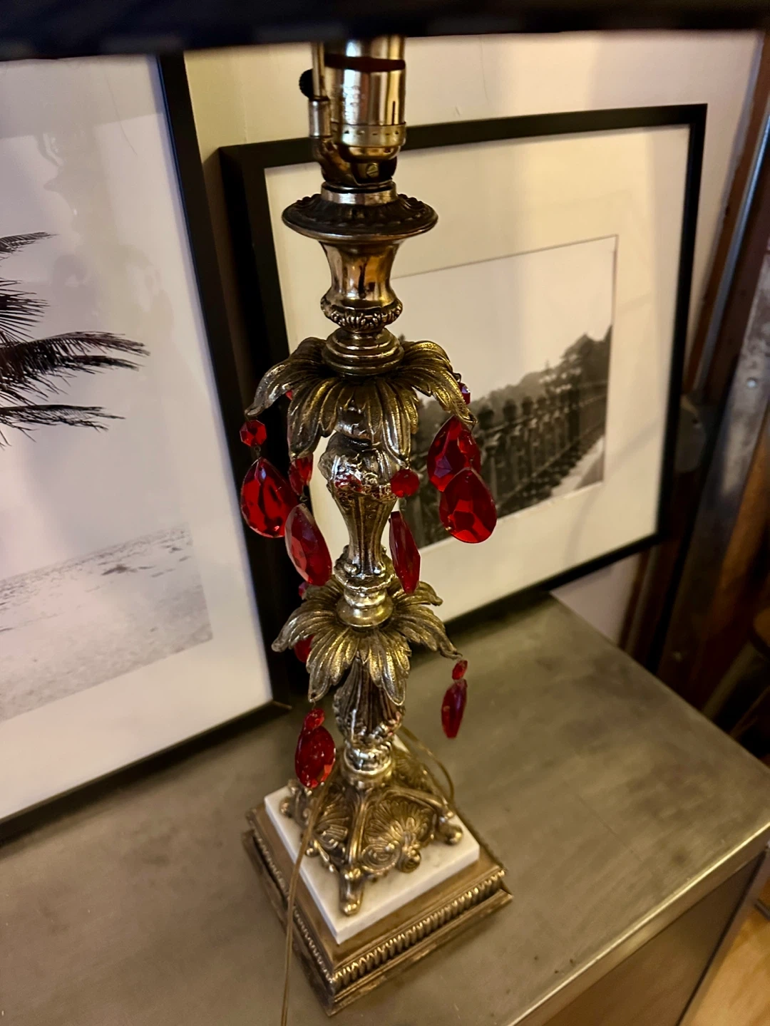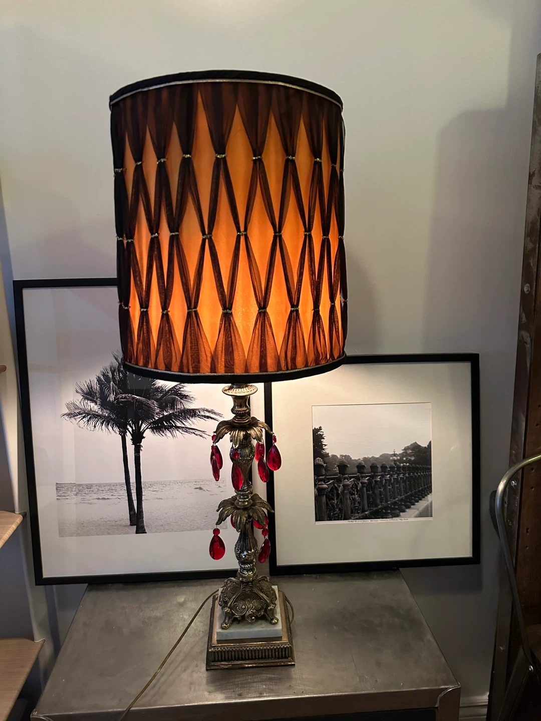 A crazy cool antique parlour lamp! Marble base with brass filigree & a simply spectacular shade that offers warm diffused light. Works great and switch has a dimmer.