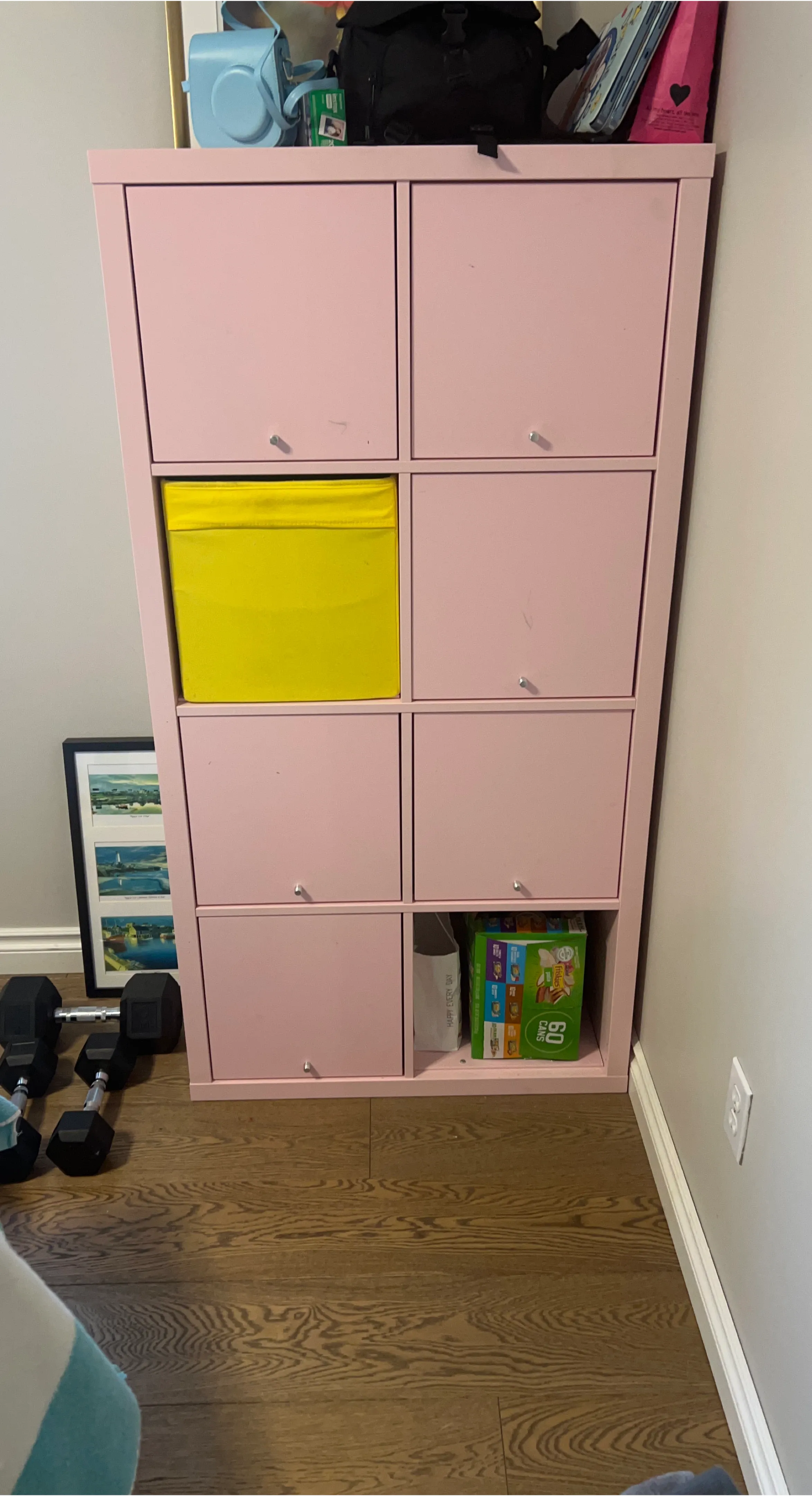 This is a pink storage cube organizer unit. It has eight compartments, one of which currently holds a yellow fabric bin. The unit is made of composite wood and has silver knobs on each door. It's a great way to organize toys or books!