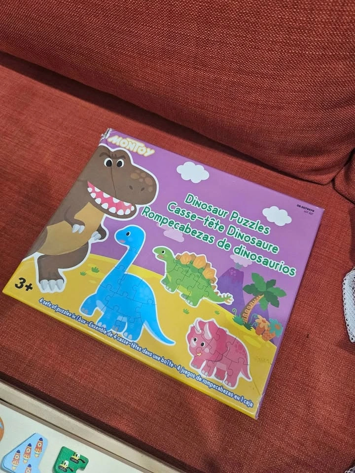 There are 5 different paw patrol puzzles varying in puzzle sizes, wooden number puzzle, and dinosaur puzzle (has 4 different dinosaurs, very easy puzzle for a toddler).