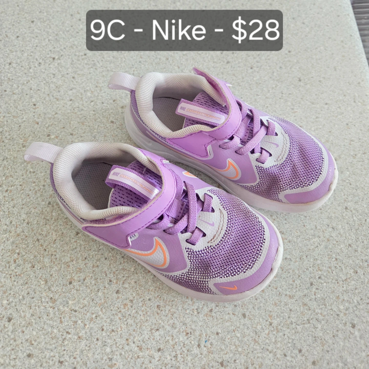 These are purple Nike Cosmic Runner toddler shoes in size 9C. They feature a mesh upper and hook-and-loop closure for easy on and off. Perfect for little ones on the go!