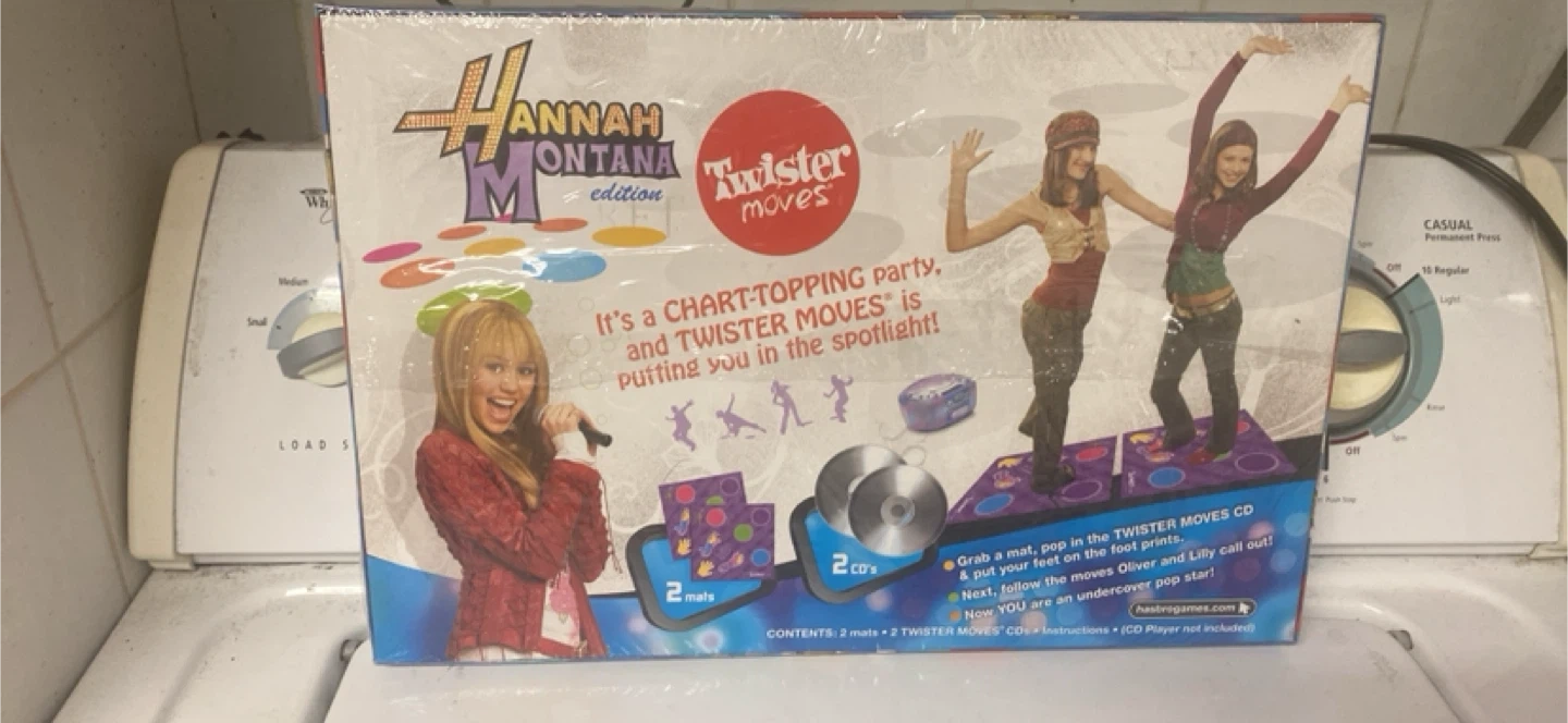It's a chart-topping party and Twister Moves is putting you in the spotlight! Grab a mat, pop in the Twister Moves CD, and put your feet on the floor prints. Now you're an undercover pop star! Includes 4 Hannah Montana songs.