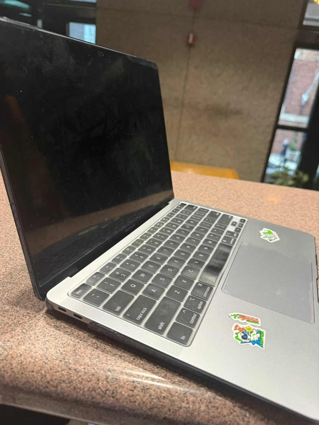 This is a silver Apple MacBook Air laptop. It features a standard QWERTY keyboard and a trackpad. Some stickers are present on the casing. It's ready for a new user!