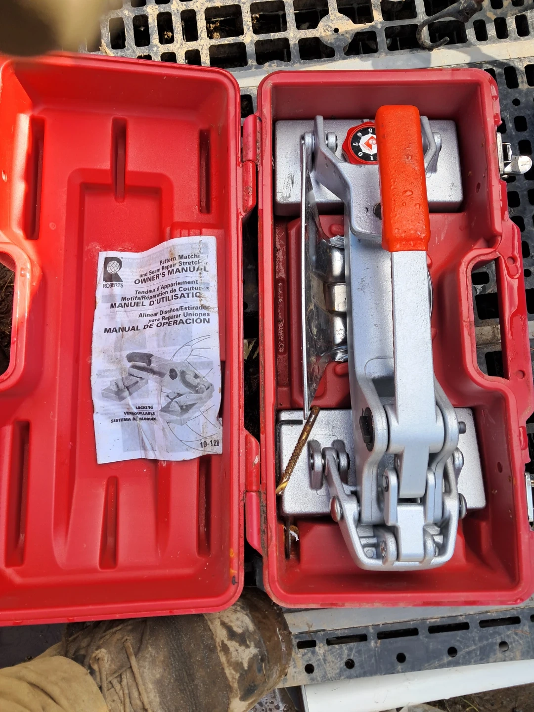 This is a Roberts brand tool for locking patterns and stretching seams. It comes with its original case and owner's manual. It's designed for linear designs and pattern matching with a locking system.