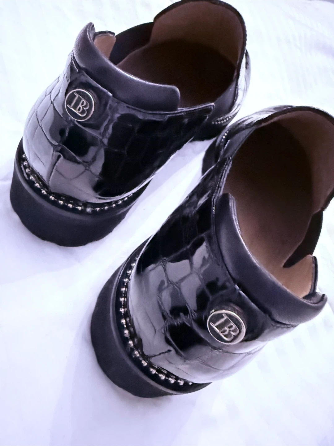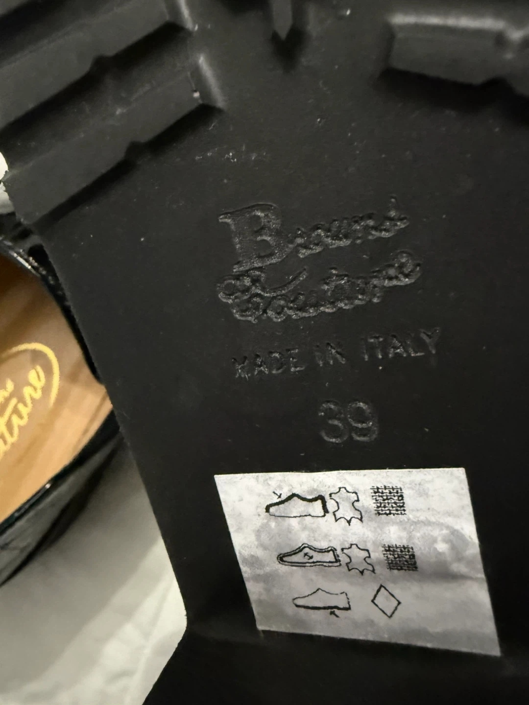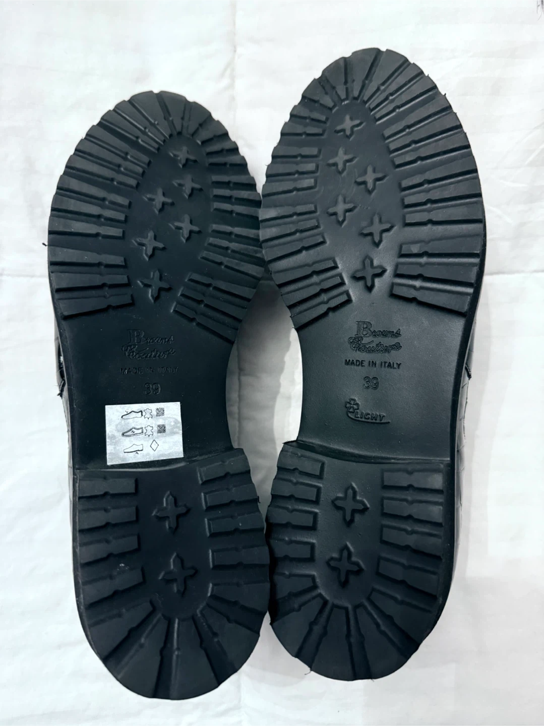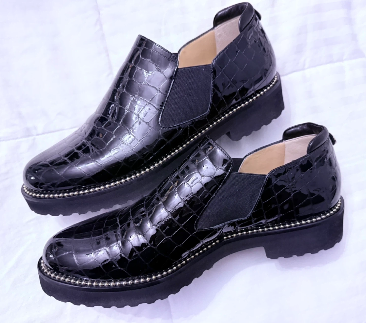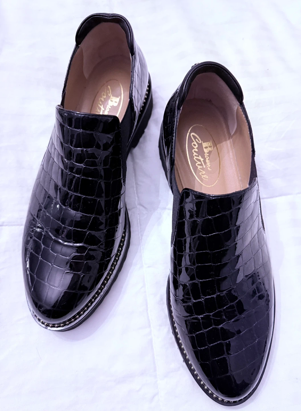 Stylish black leather slip-on shoes from Browns Couture! These shoes feature a unique crocodile-like texture and a comfortable design. Perfect for adding a touch of elegance to any outfit