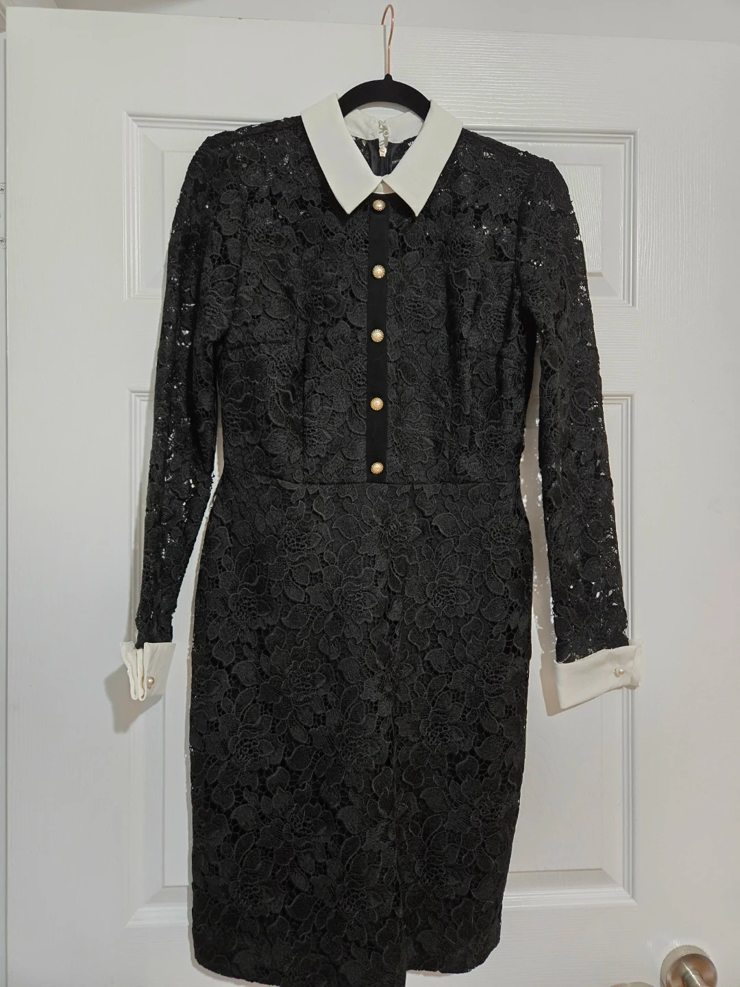 Elegant black lace sheath dress featuring a contrasting white collar and cuffs. It has a button-front closure with decorative pearl-like buttons. The lace pattern is intricate, and the dress has long sleeves. Suitable for semi-formal occasions.
