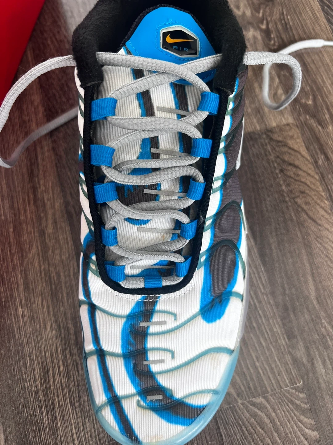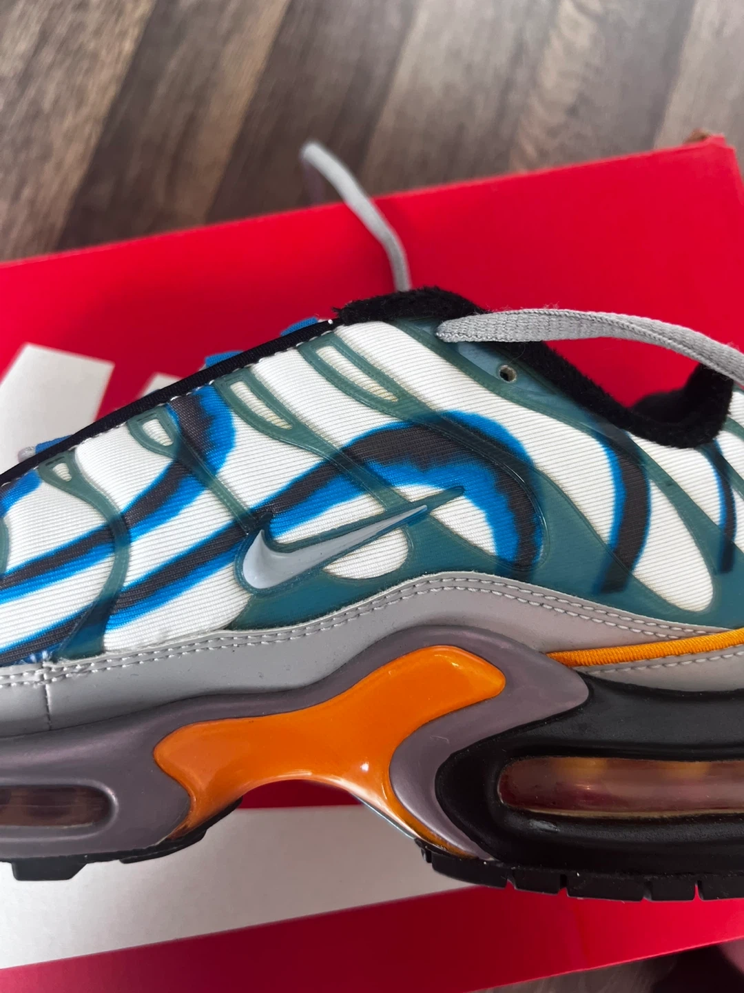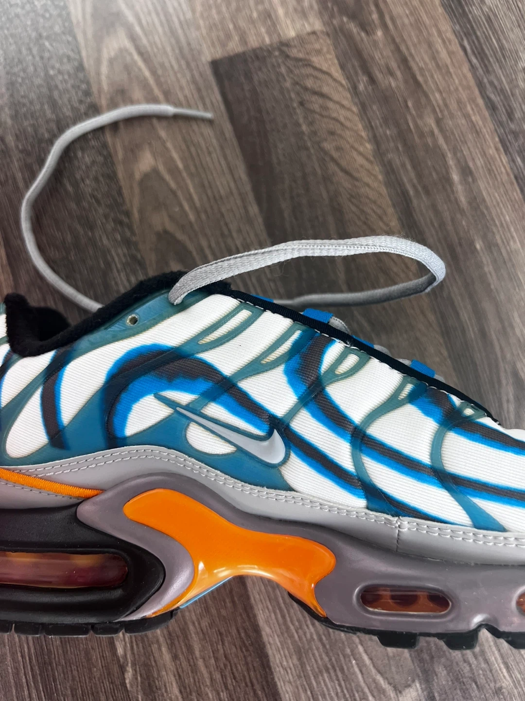 These Nike Air Max Plus TN SE shoes feature a unique white, blue, and grey colourway with orange accents. They include the signature Air Max cushioning and a durable rubber sole. The original box is also included!