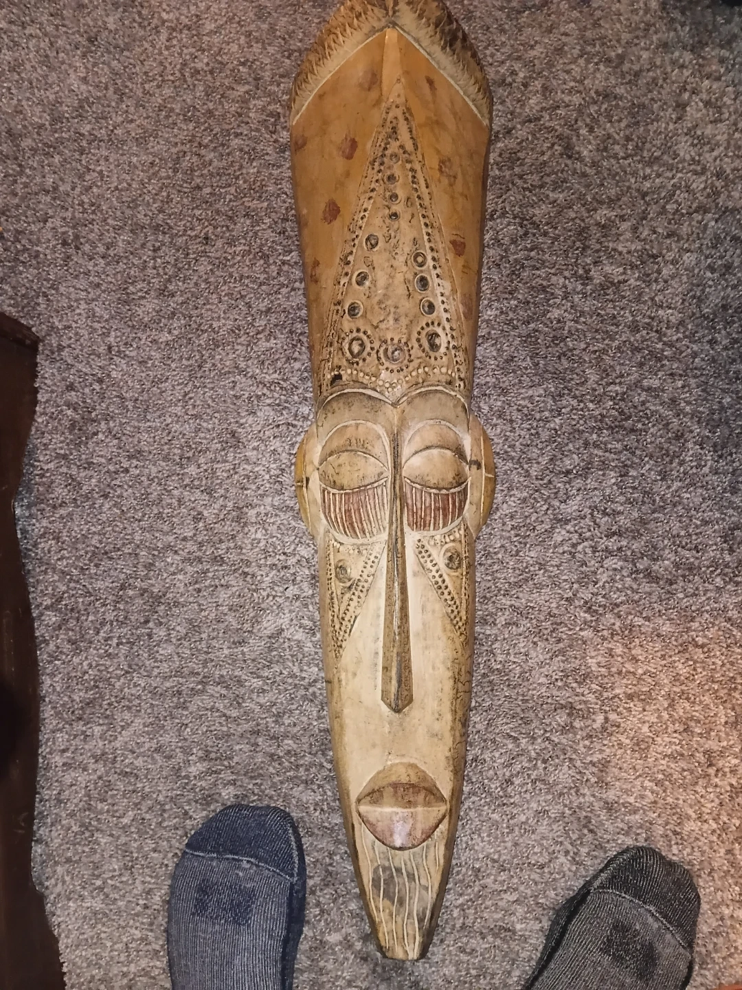 This is a decorative wooden mask with intricate carvings and painted details. It has a light brown and beige finish. It's a unique piece for home decor.
