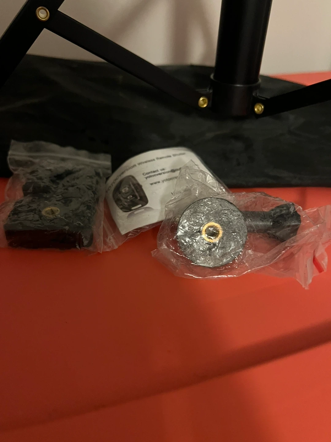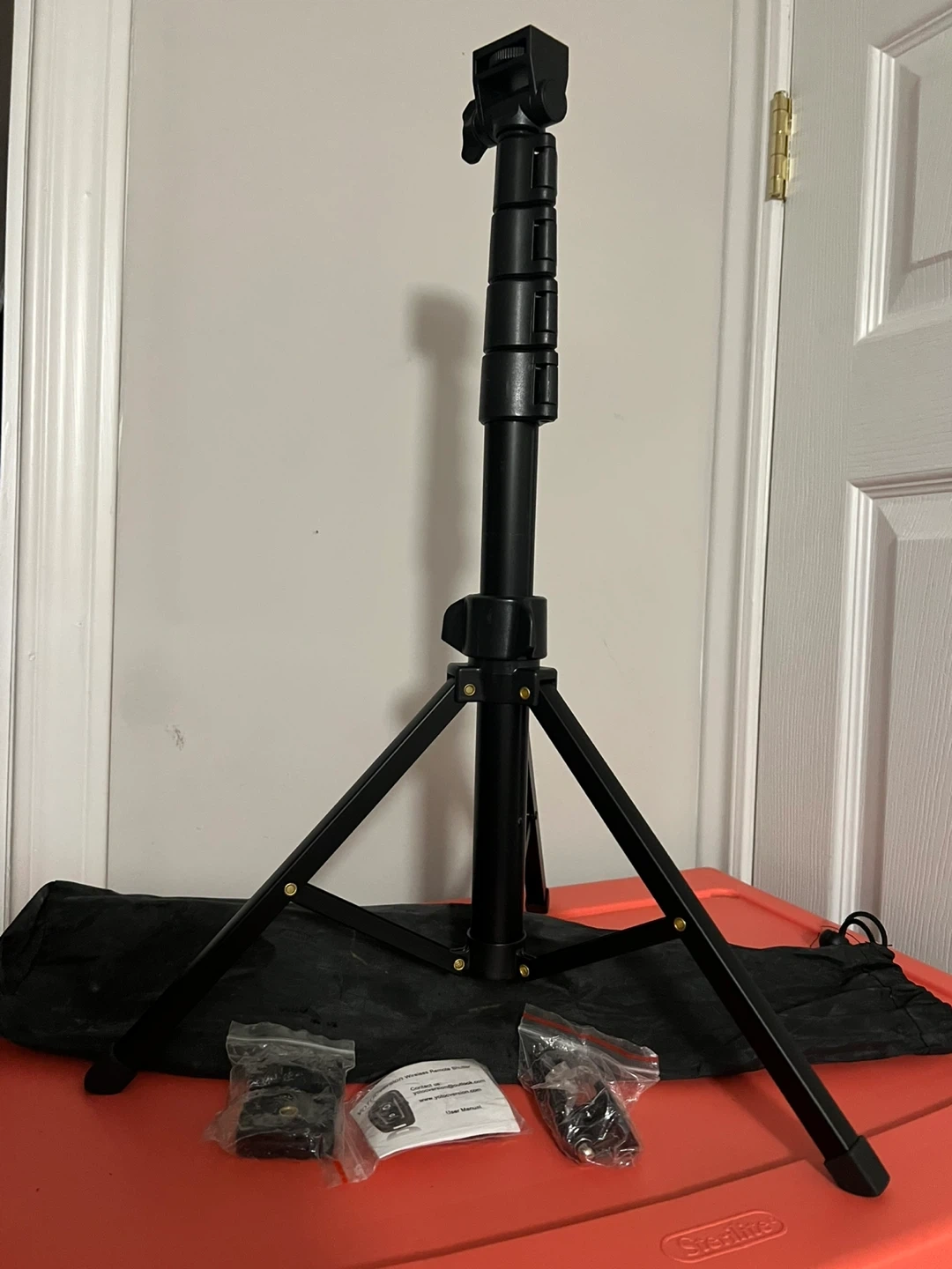 This is a black, extendable tripod with a wireless remote shutter. It includes various mounts and accessories.