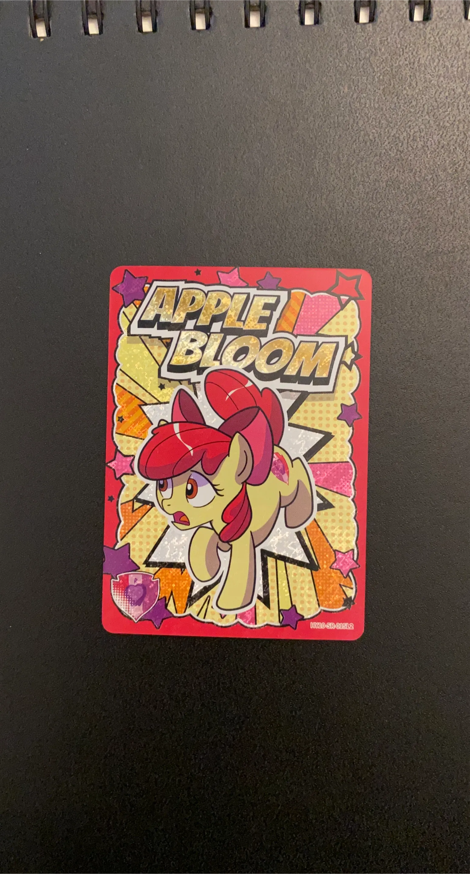 This is a collectible card featuring Apple Bloom from My Little Pony. It has a vibrant design with glitter accents. It's a fun item for fans of the show!