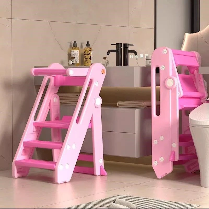 This is a pink, multifunctional step stool for kids. It's adjustable from 3 to 2 steps for different ages. This stool helps kids reach counters for tooth brushing or learning to cook, and shelves for toys. It's a handy helper for little ones around the house!