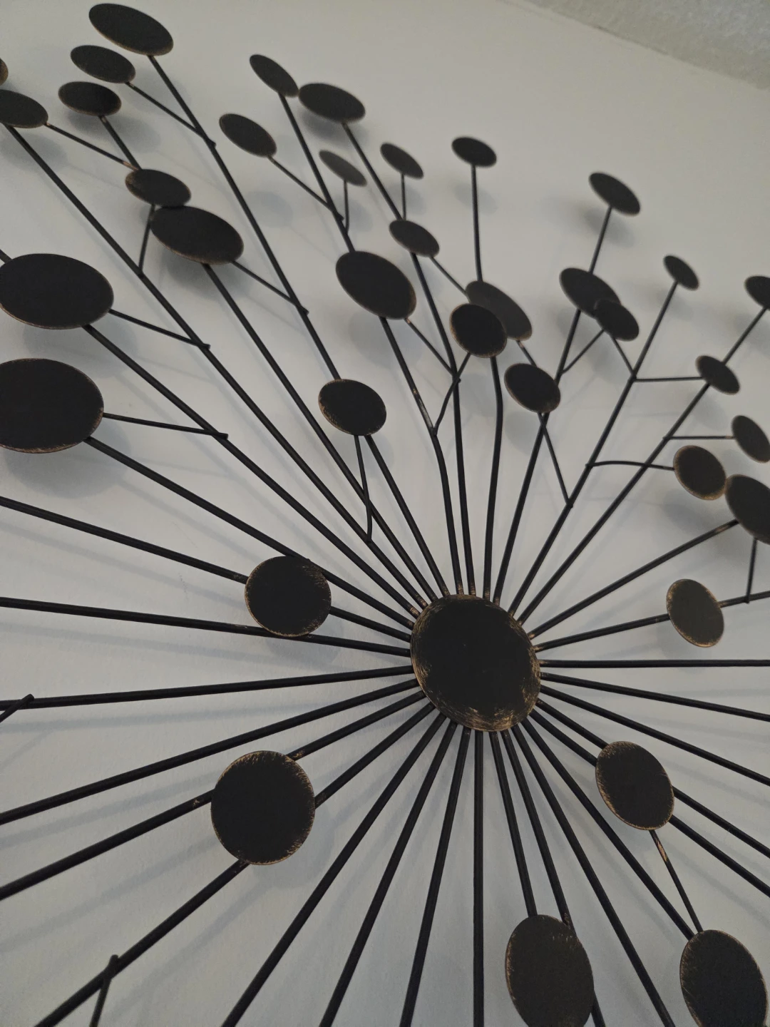 This striking metal wall art piece features a black dandelion-inspired design. It's made of durable metal, perfect for adding a touch of modern flair to any room. Its unique silhouette creates a dynamic focal point!