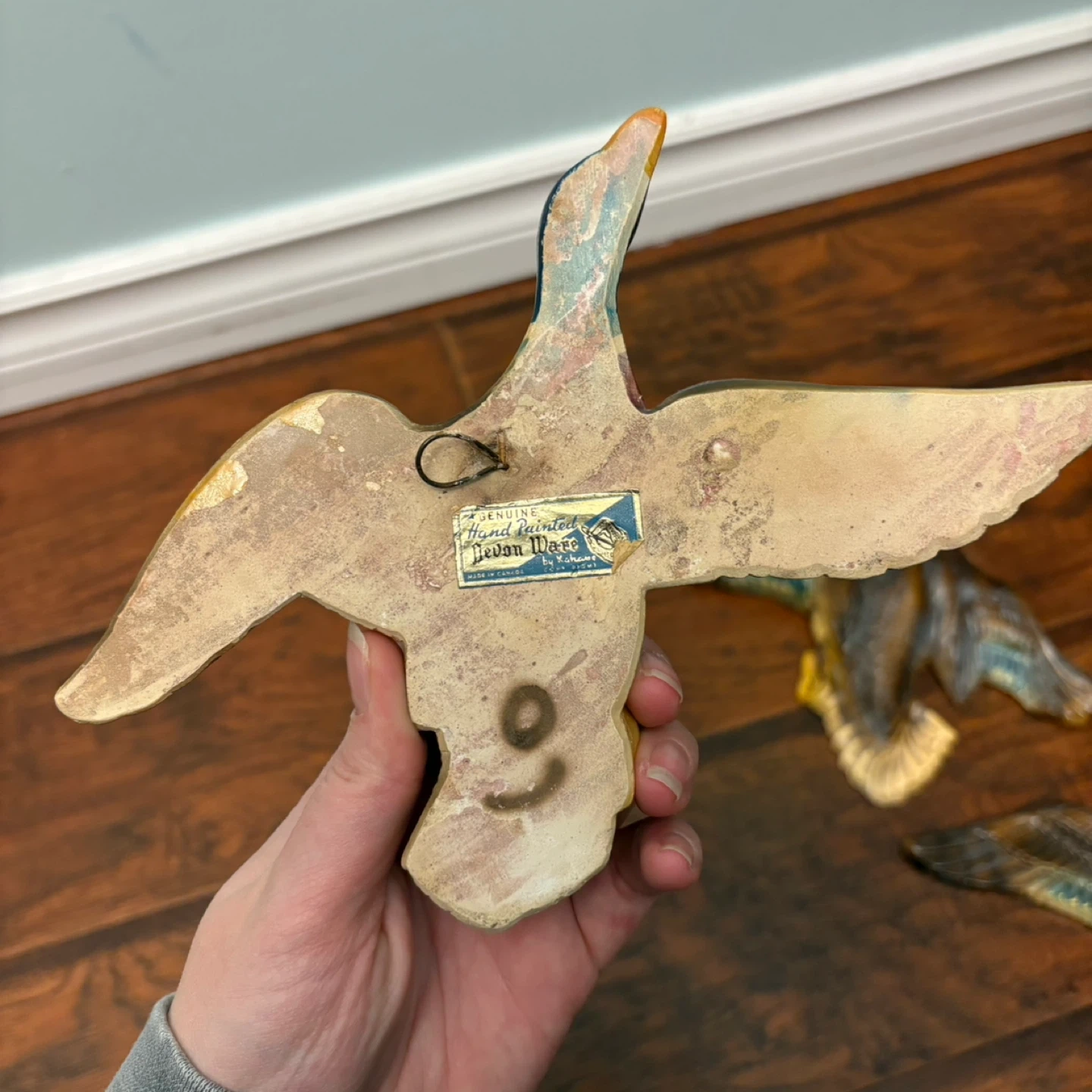 These are hand-painted wall plaques of mallard ducks in flight. Each piece is made of ceramic and is designed to be mounted on a wall. They're a lovely addition for any wildlife enthusiast's home.