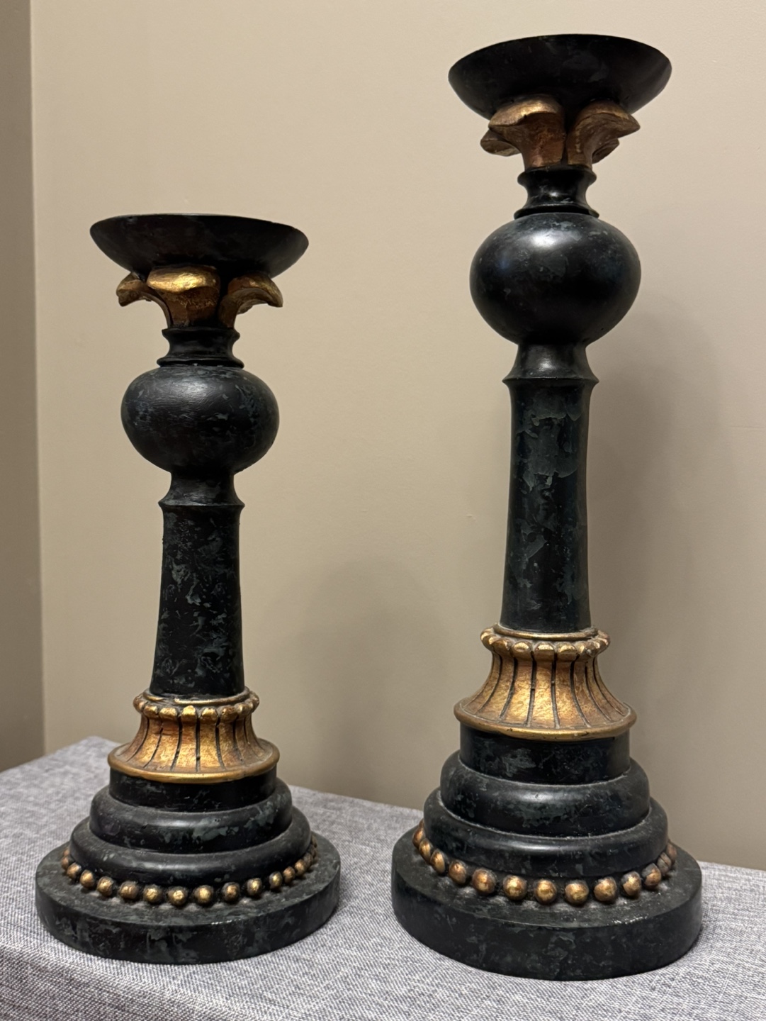 Set of two black and gold candle holders. One tall and one short. Made of a textured material with a black marbled and gold finish.