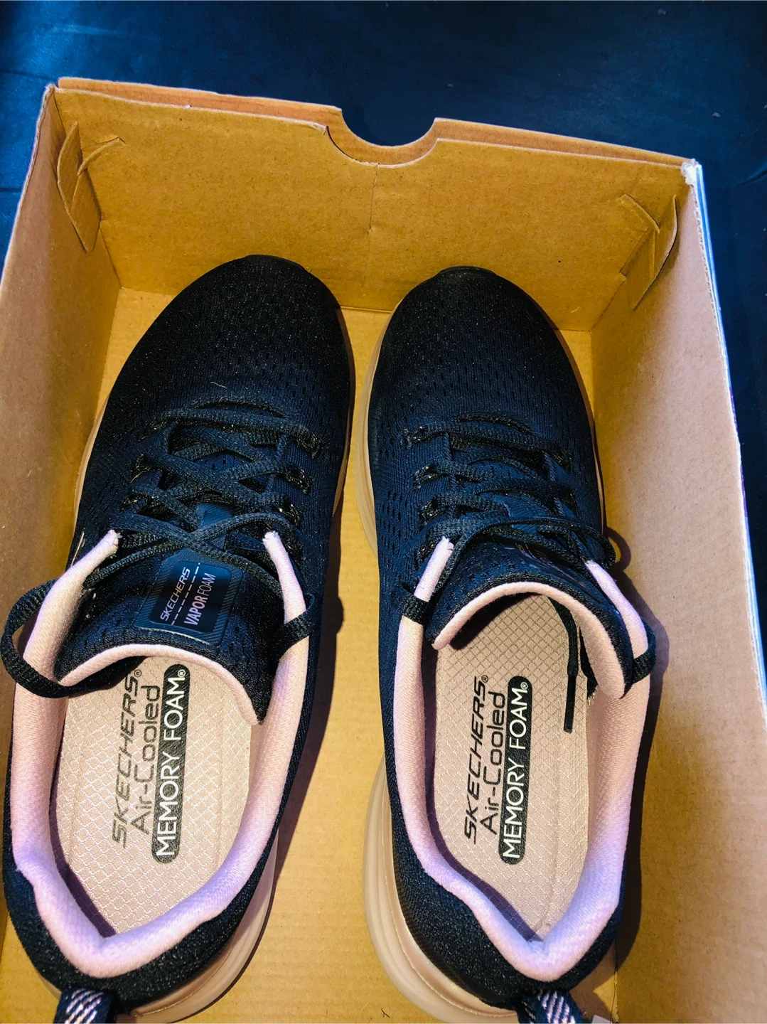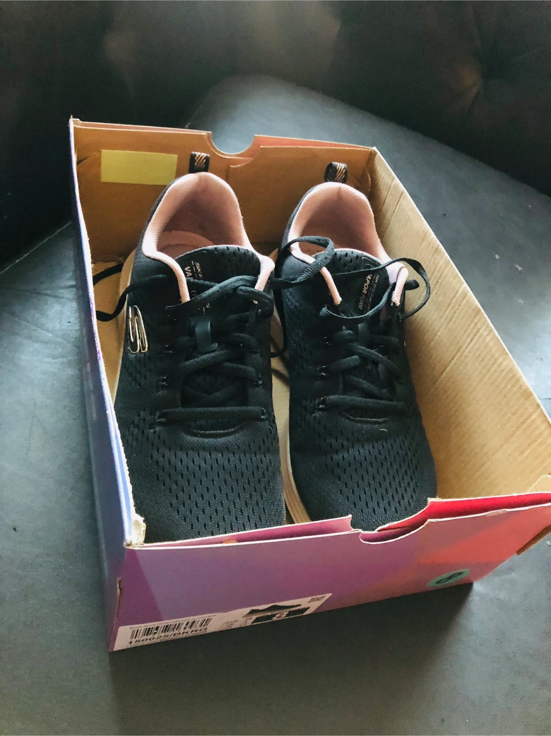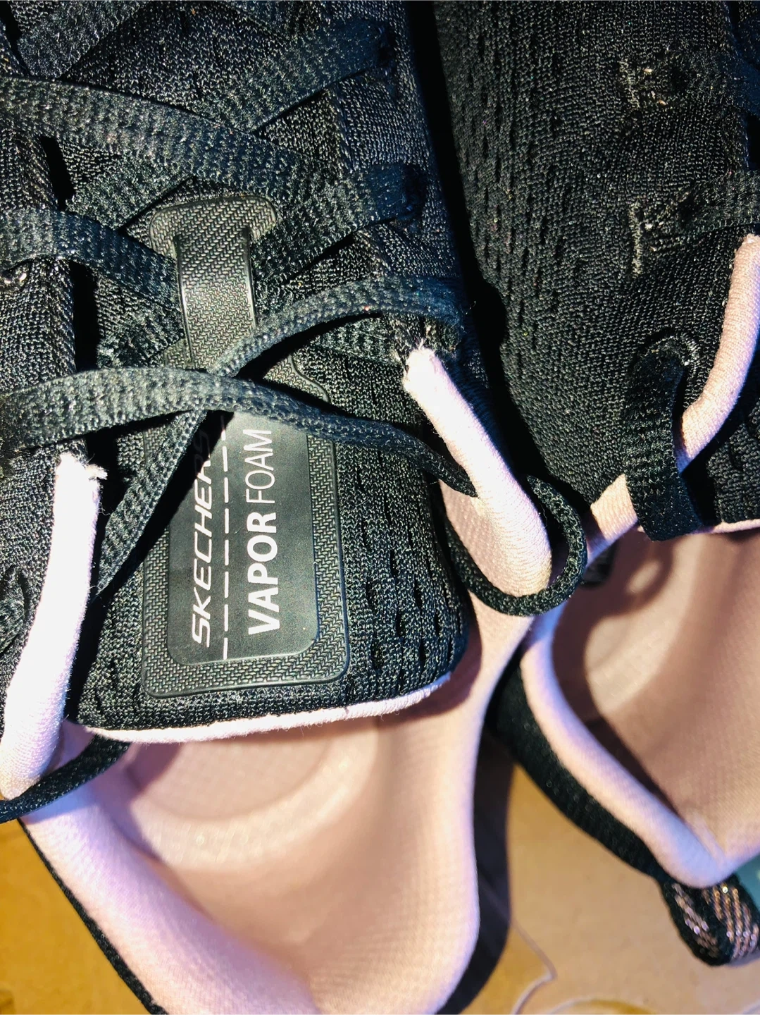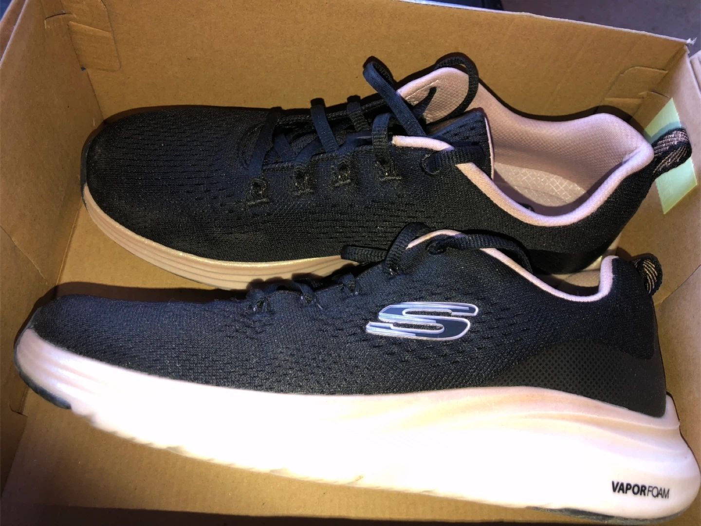 ✨🌟Only $35!!!⭐️🎉These Skechers trainers feature a black breathable mesh textile, with a pink trim and Vapor Foam sole.
