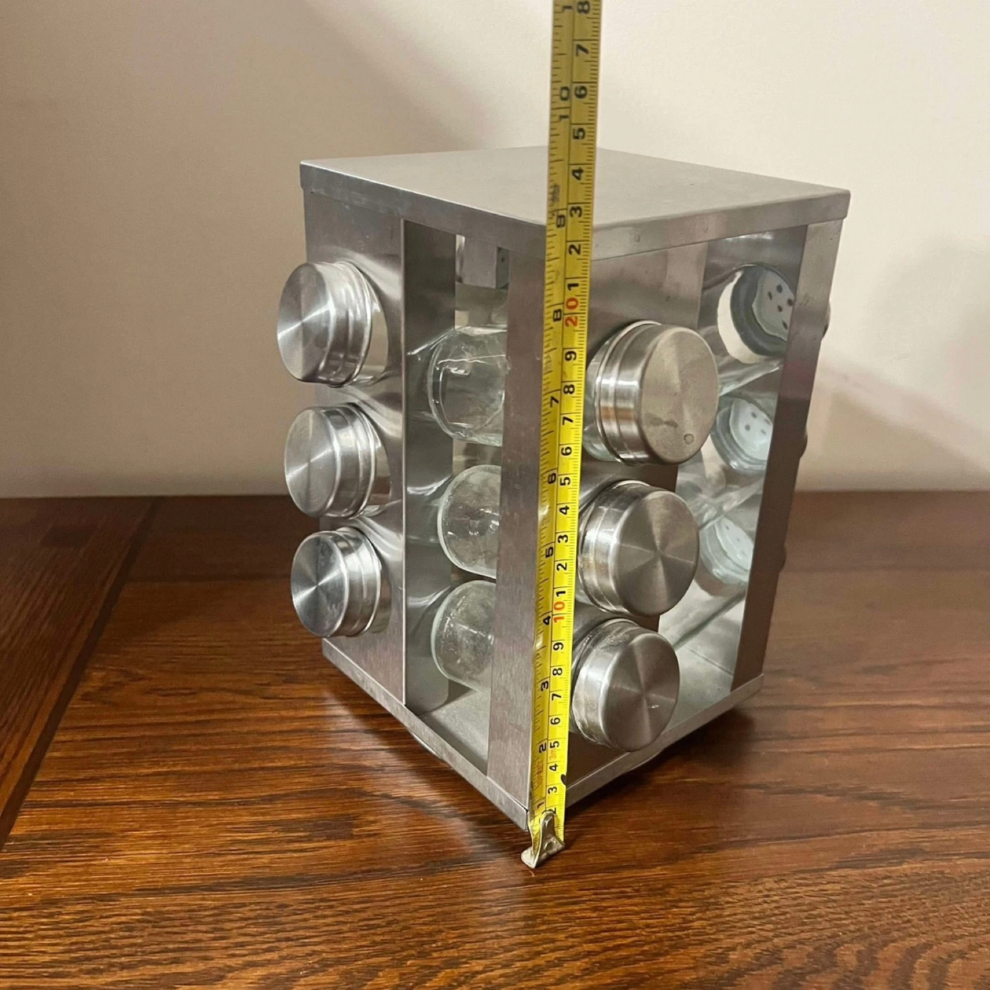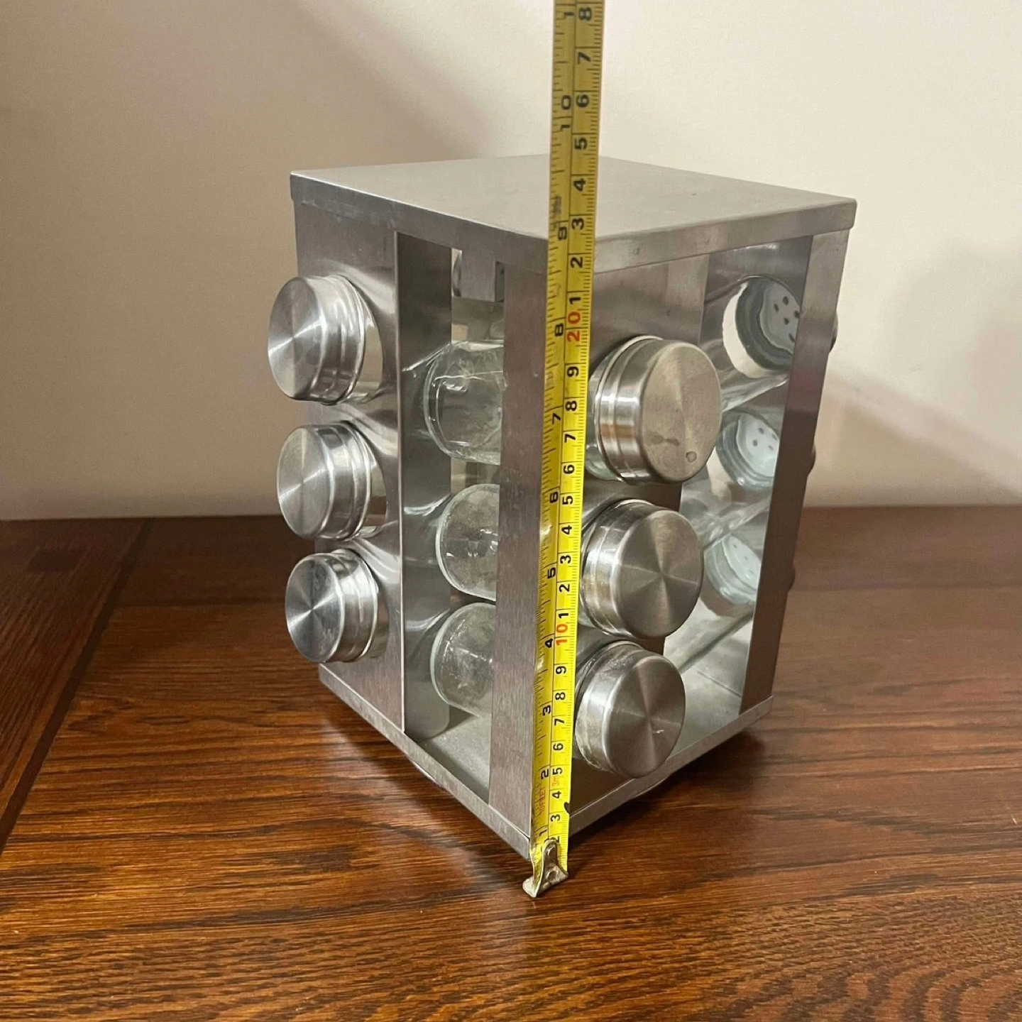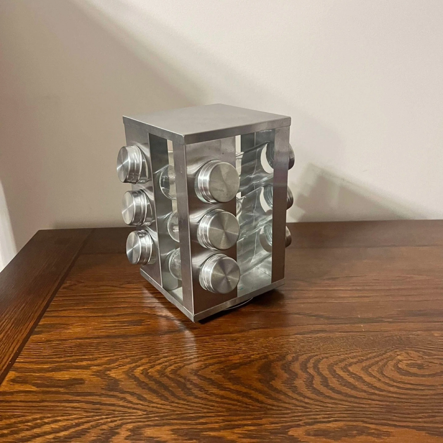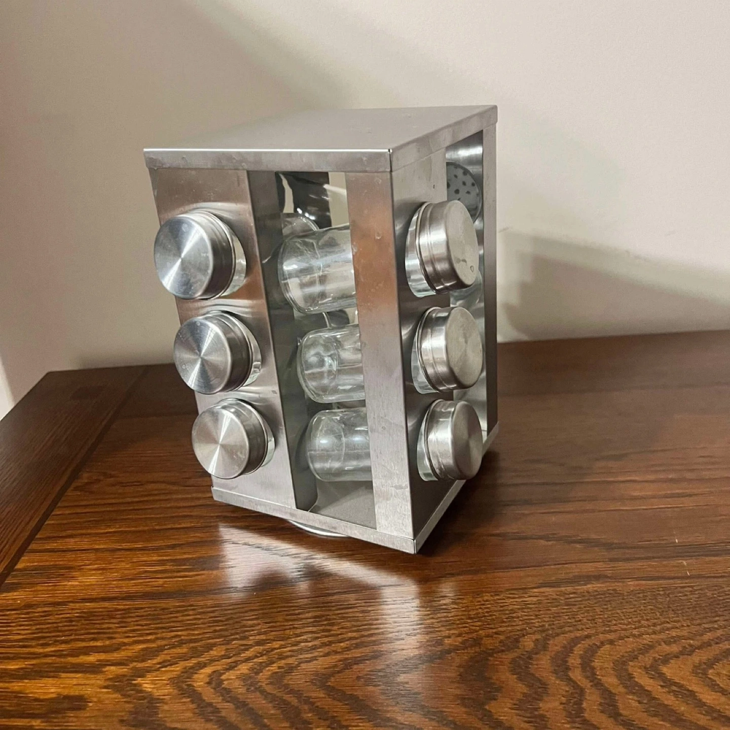 Here's a handy rotating spice rack! It's made of stainless steel and comes with the glass jars.