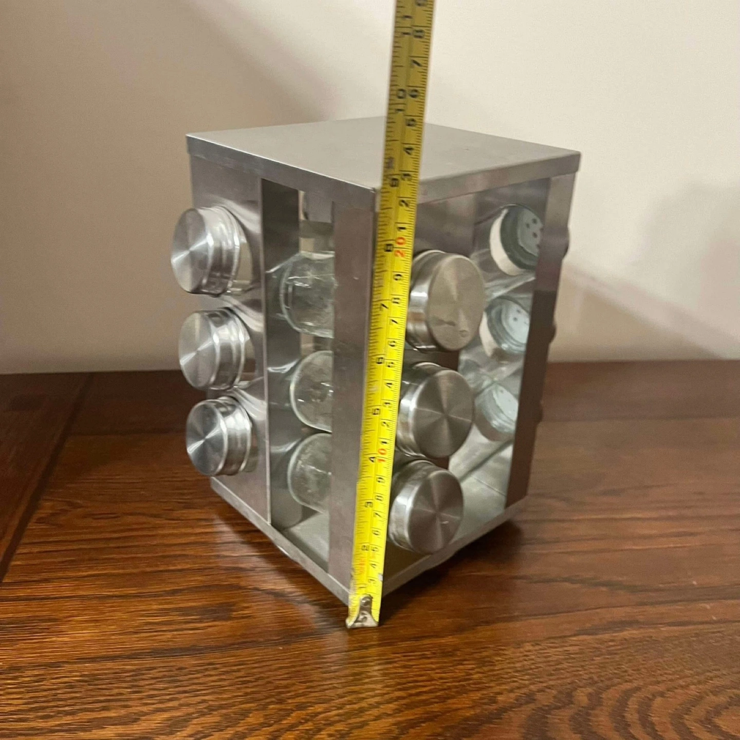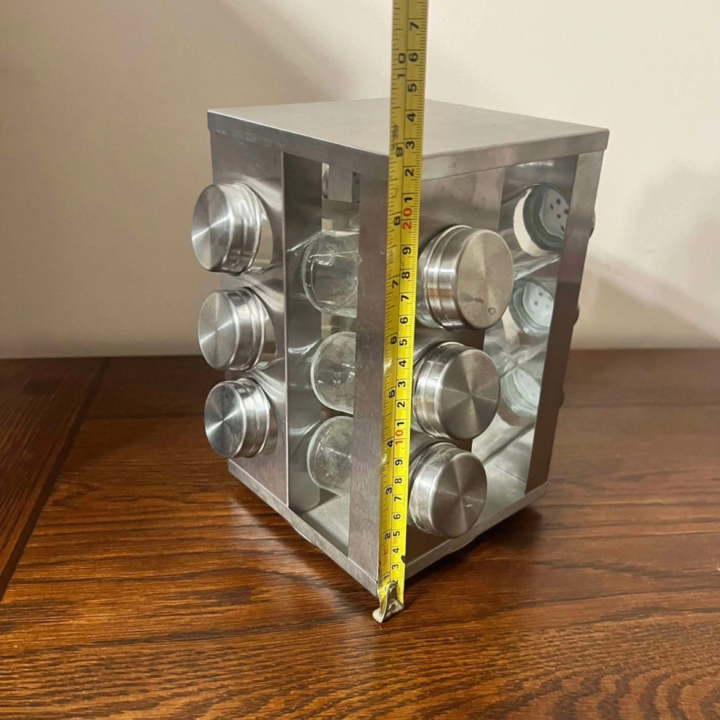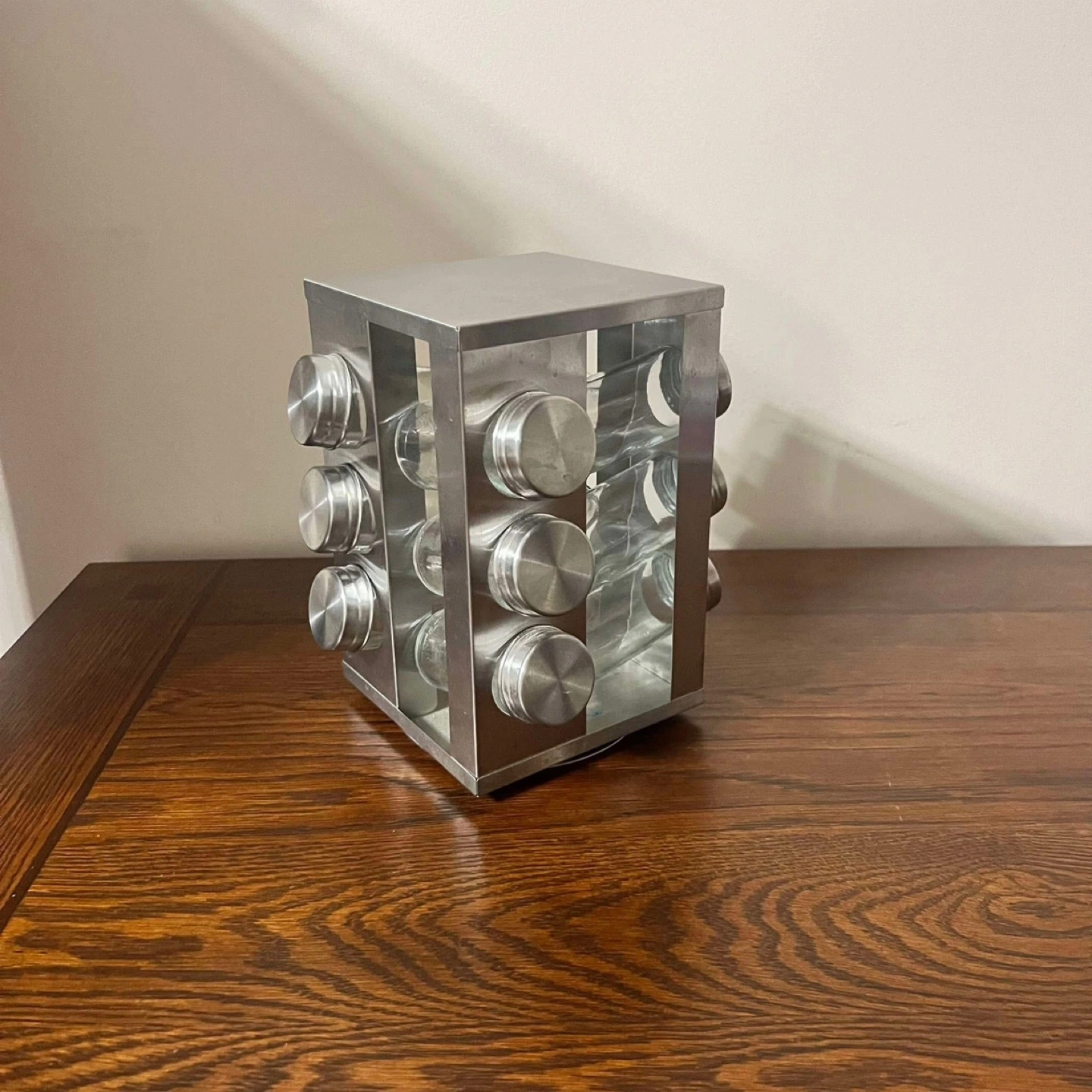 Here's a handy rotating spice rack! It's made of stainless steel and comes with the glass jars.