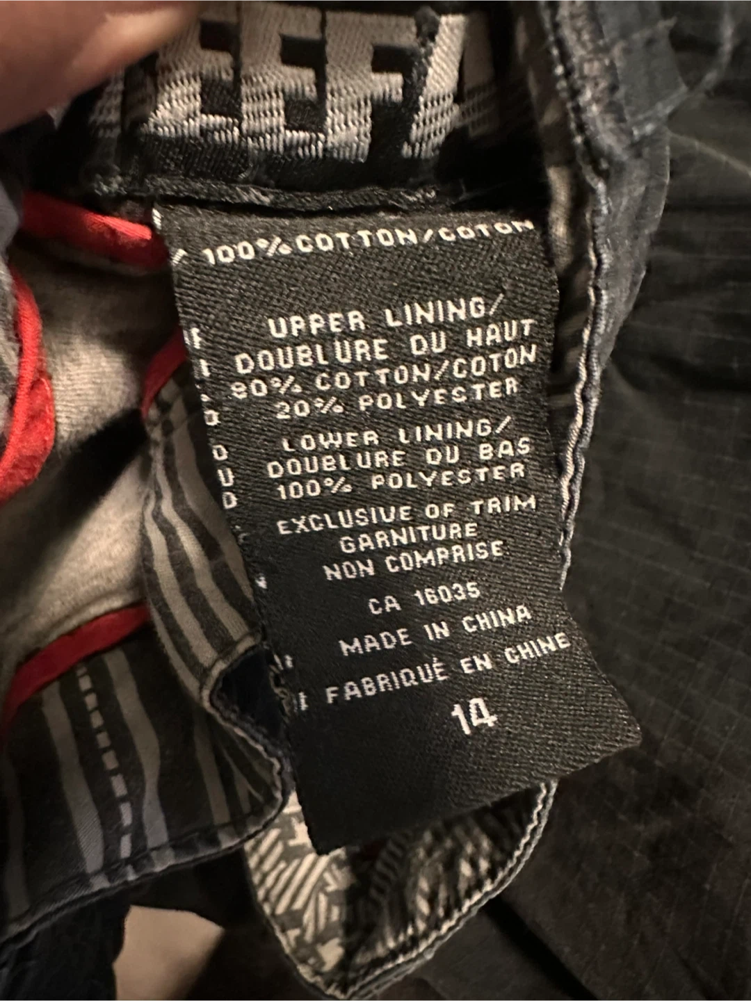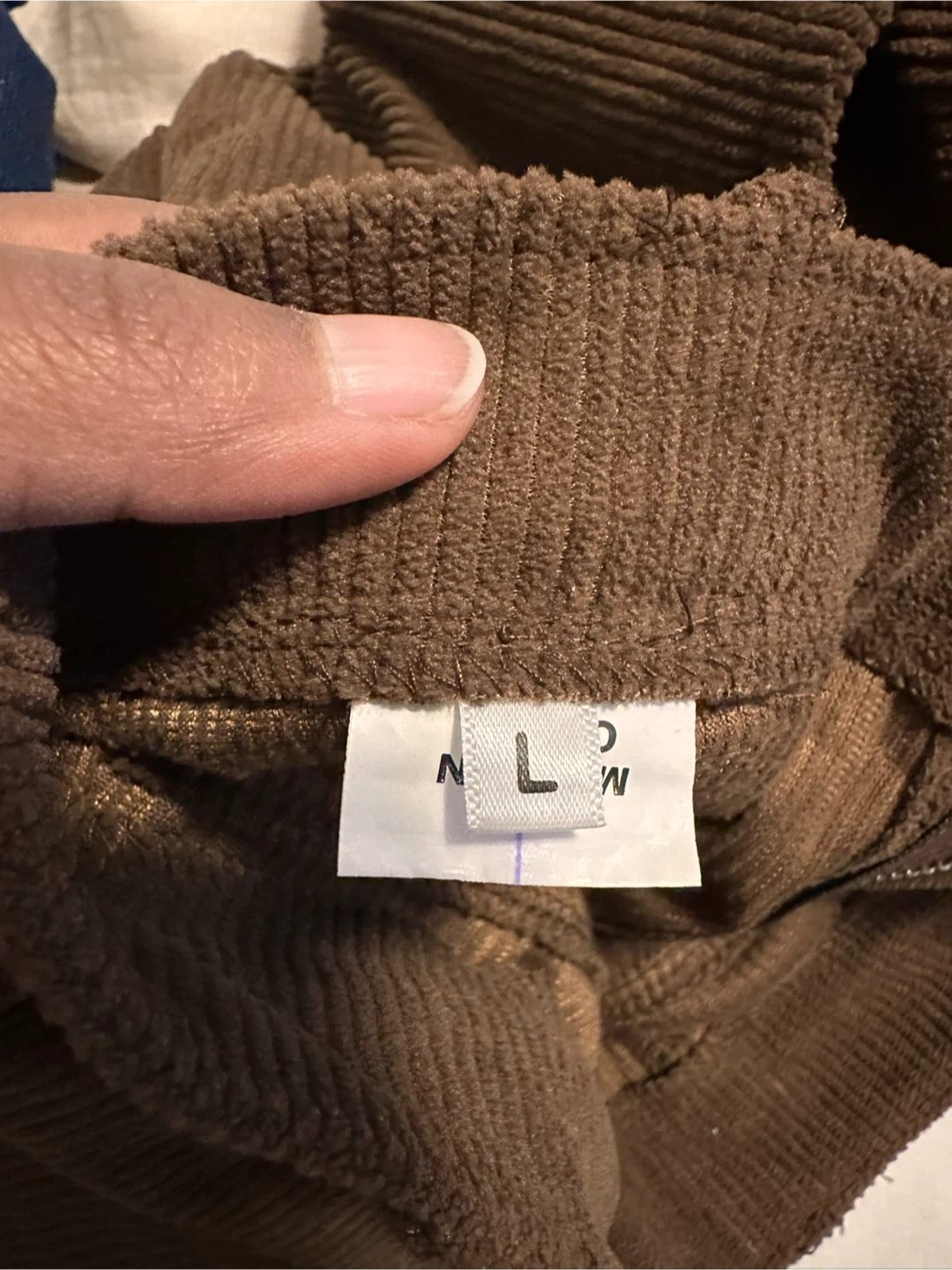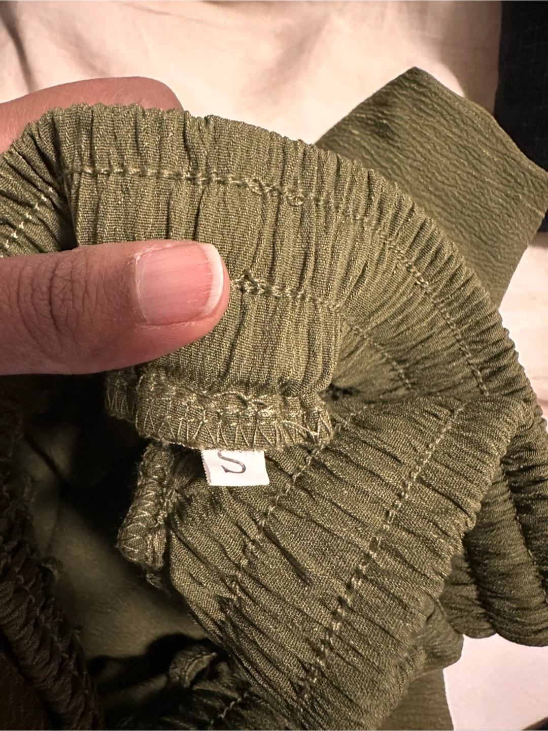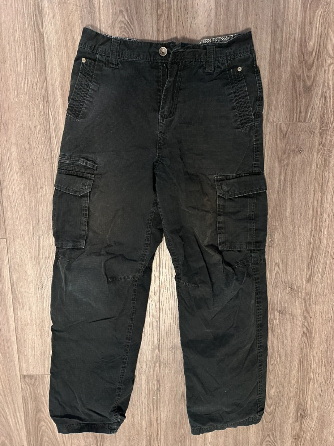 Selling three pants in good condition, brown corduroy pants size L, black cargo pants size 14, and green pants size S. Ready for a new home.