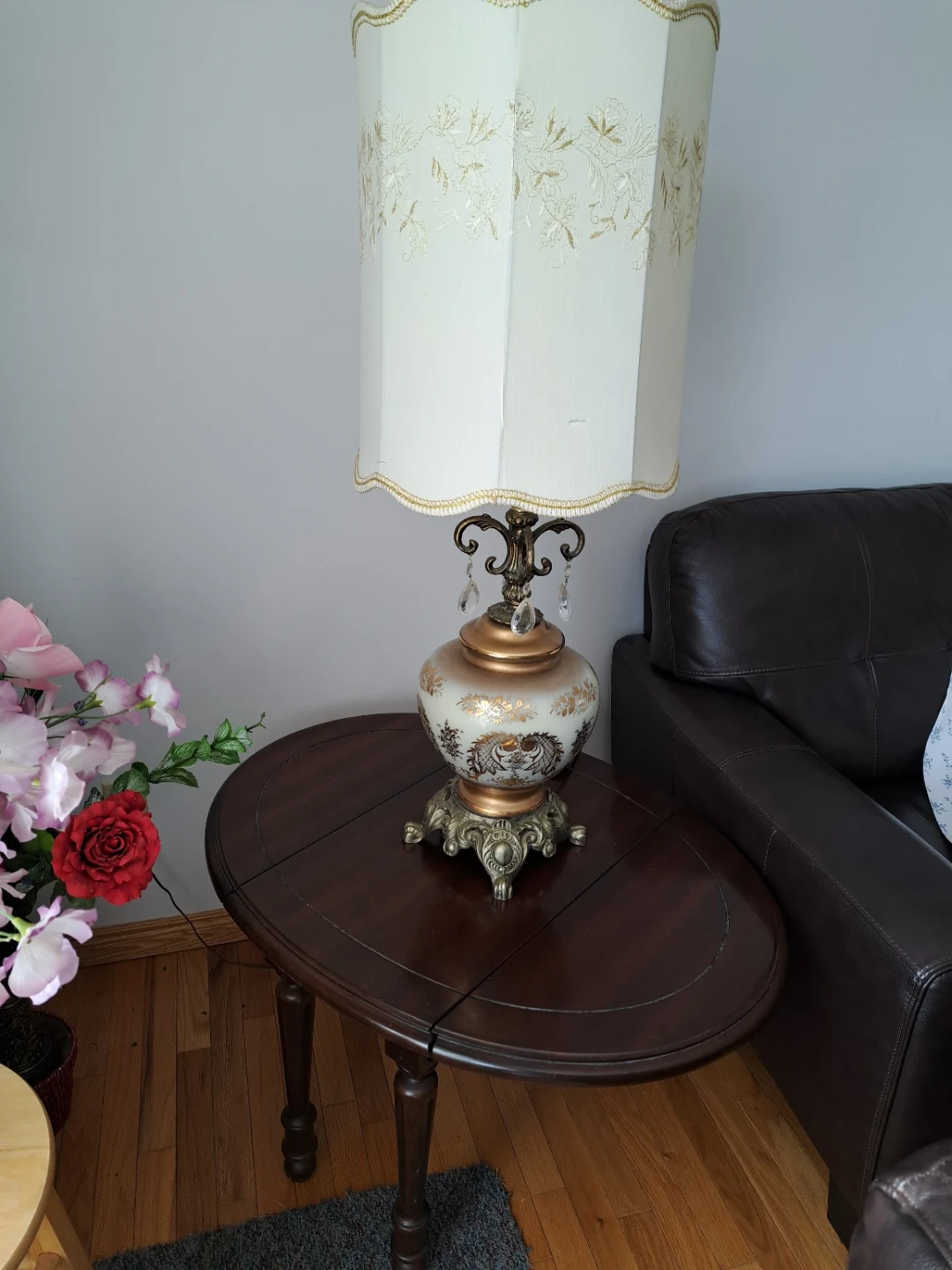 - Lampshade: cream/off-white fabric; table finish: brown with gold/brass accents