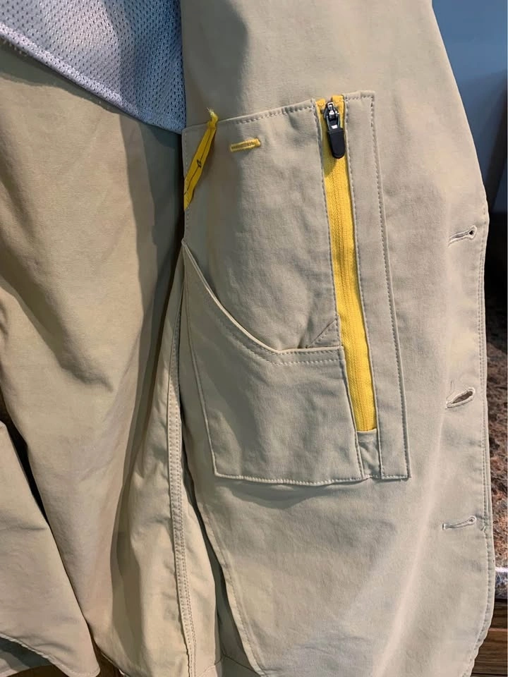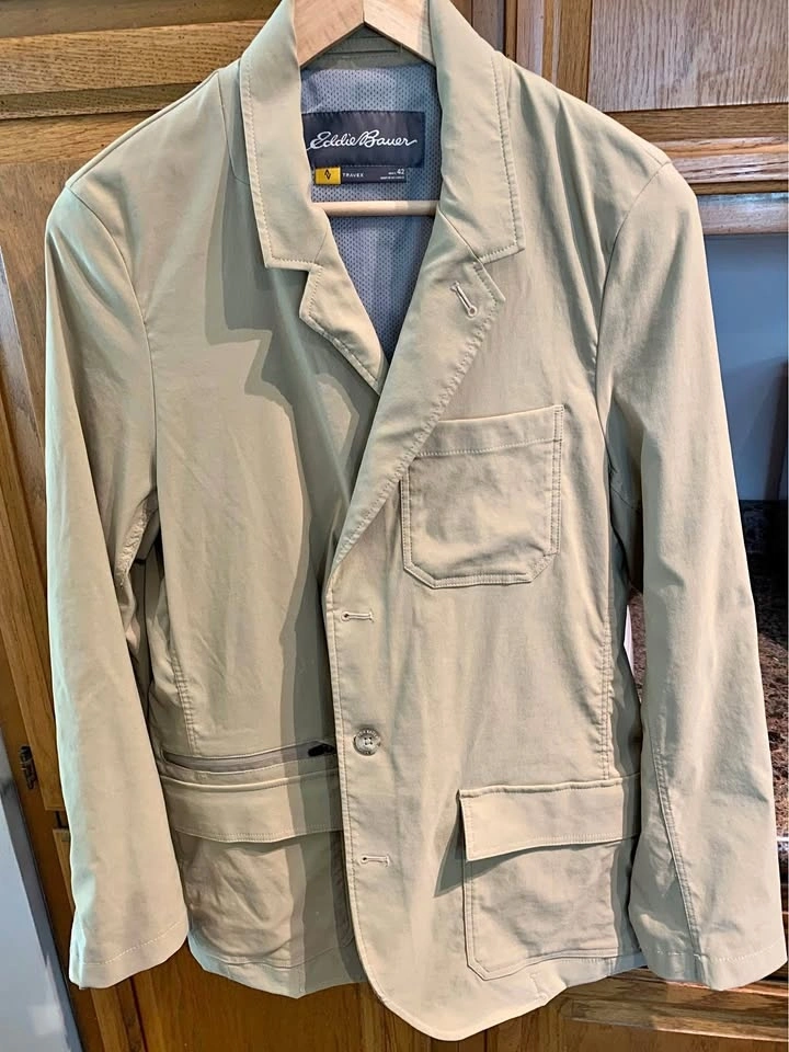 Eddie Bauer Mens Travex Ultimate Voyageur Travel Blazer. Dark Khaki, size 42. Barely worn. Lightweight with 2-way stretch fabric and extra interior pockets for security. The polyester/spandex blend has a durable, water-repellent finish.