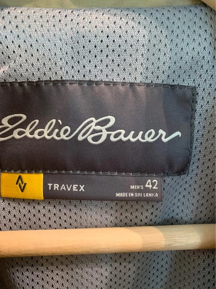 Eddie Bauer Mens Travex Ultimate Voyageur Travel Blazer. Dark Khaki, size 42. Barely worn. Lightweight with 2-way stretch fabric and extra interior pockets for security. The polyester/spandex blend has a durable, water-repellent finish.