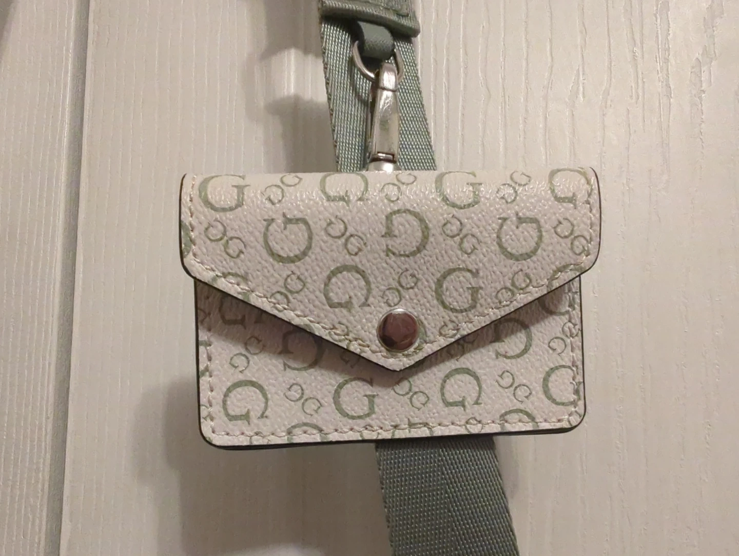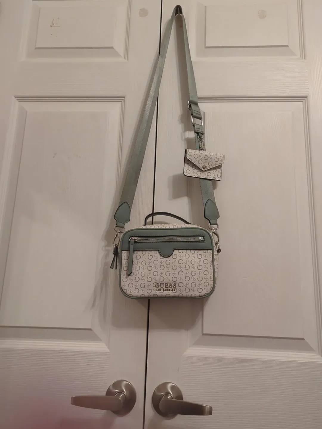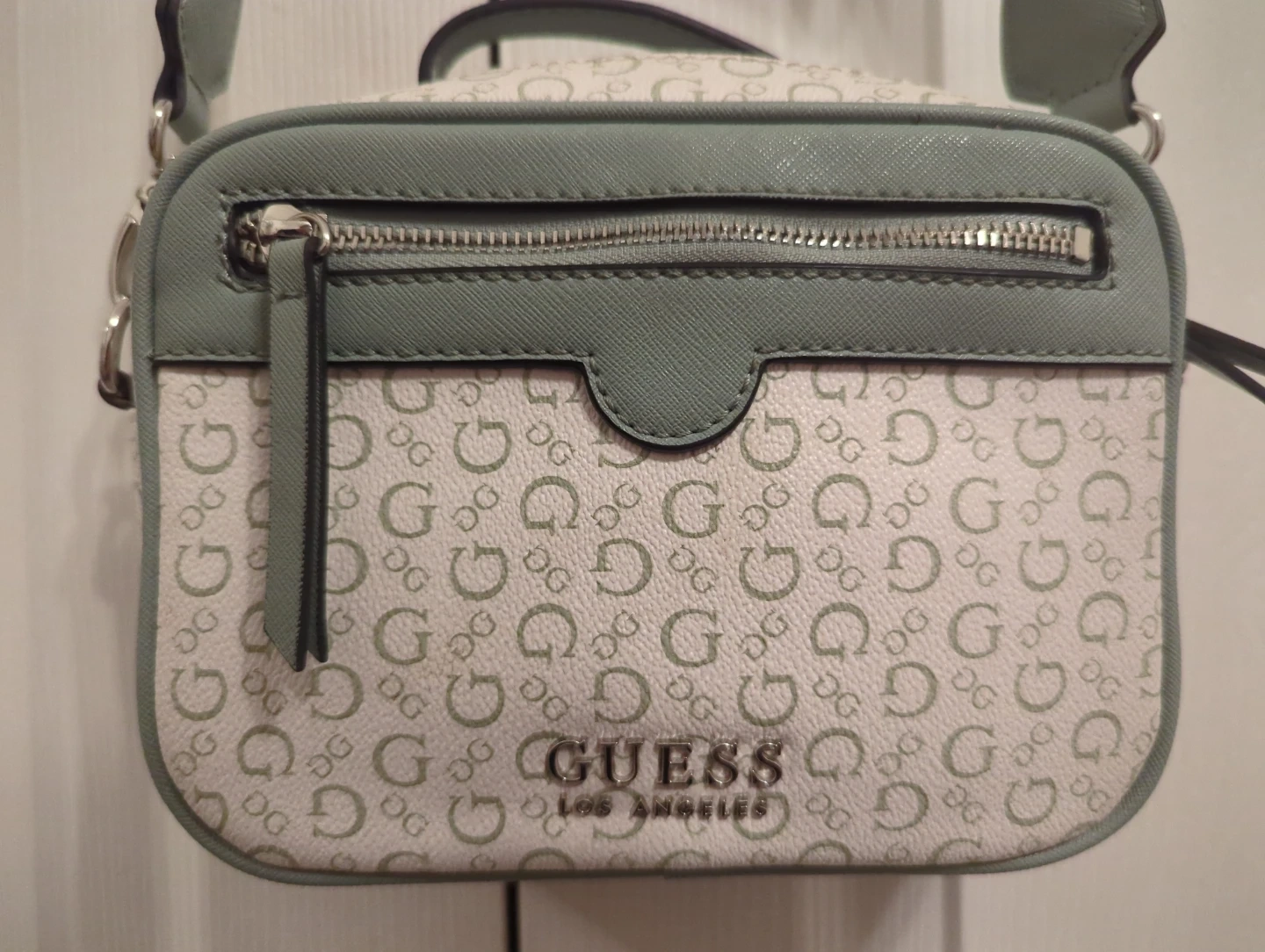 This is a cute discontinued GUESS crossbody bag. It has the all-over G logo print in white and sage green. It comes with a matching coin purse attached to the strap. Interior includes a zippered pocket and slip pockets.