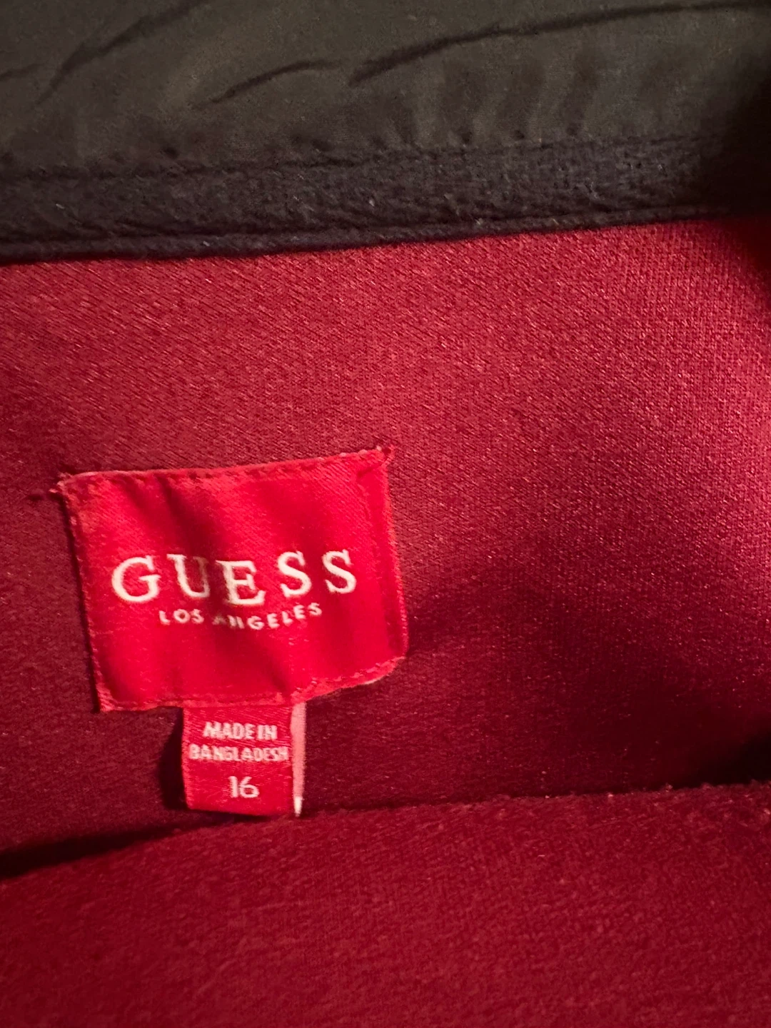 Guess tracksuit jacket in a deep red colour. It's a size 16 and made in Bangladesh. Features zippers and black trim accents.
