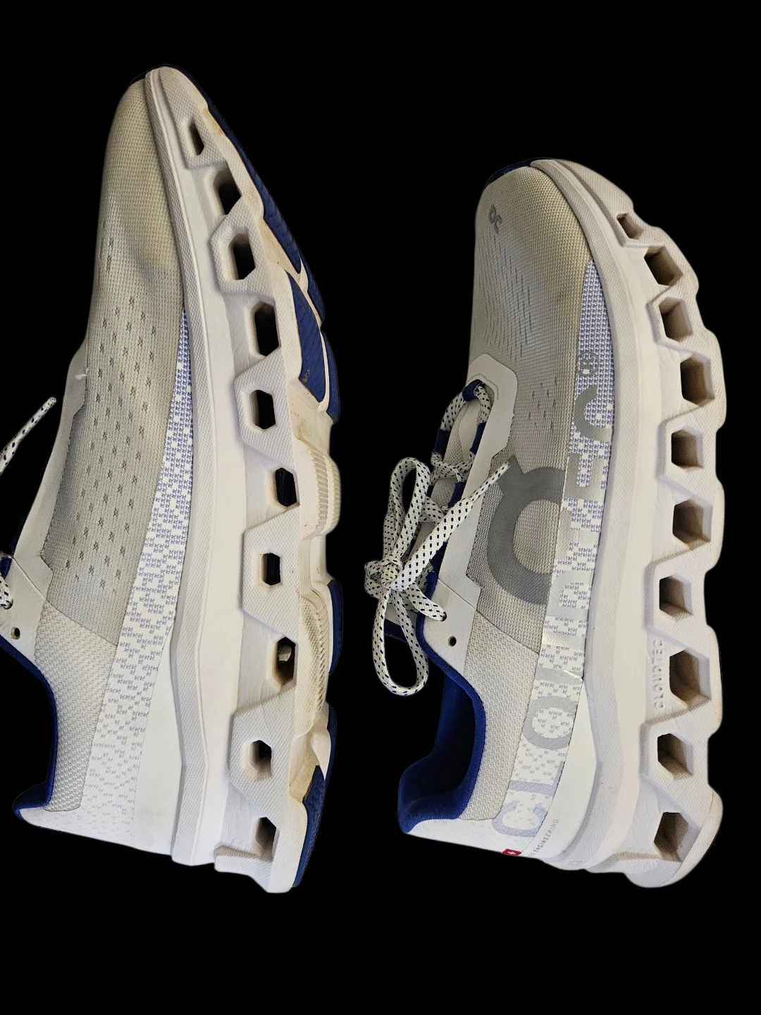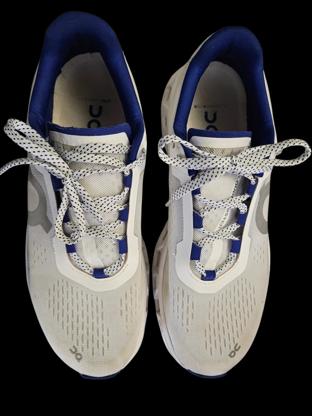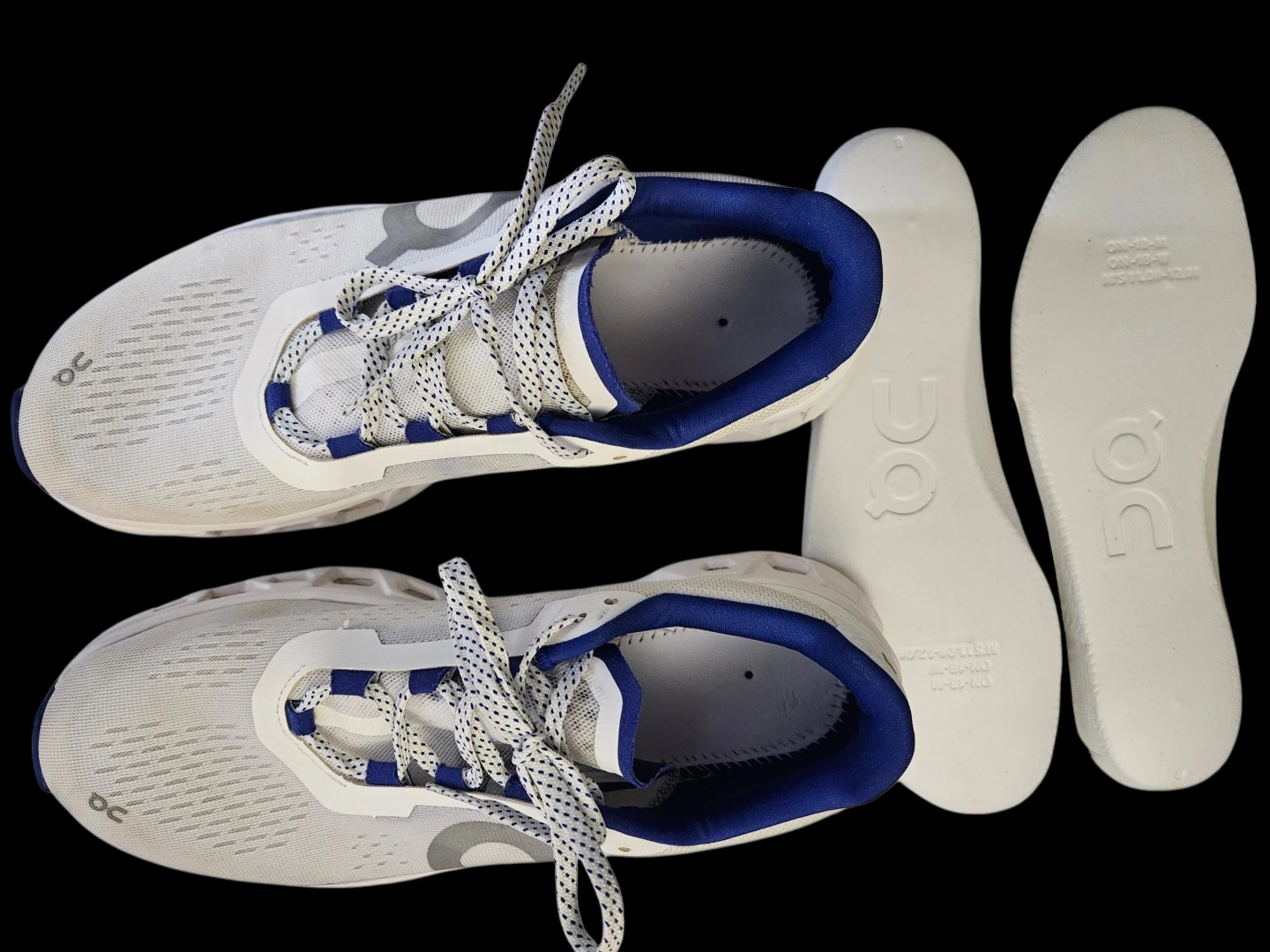 These On running shoes feature CloudTec technology for a responsive ride. They're white with blue accents and include extra insoles. Perfect for your next run!