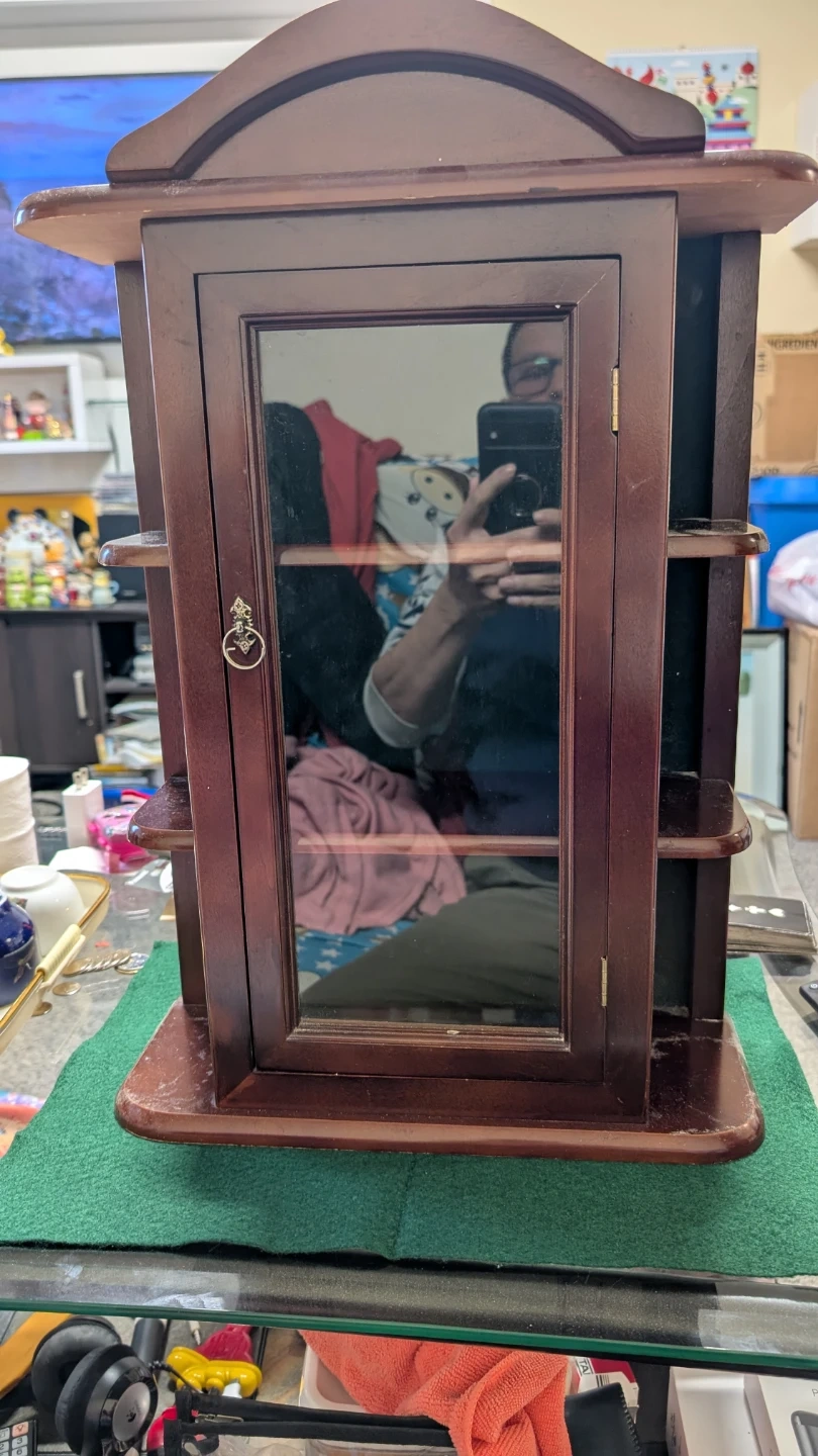 A nice wooden display cabinet with a glass door. It has three shelves inside for storage or display. This cabinet would be great for showcasing collectibles or small items!