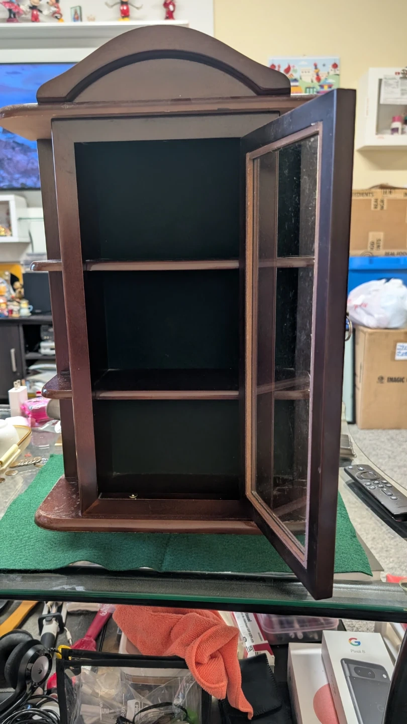 A nice wooden display cabinet with a glass door. It has three shelves inside for storage or display. This cabinet would be great for showcasing collectibles or small items!