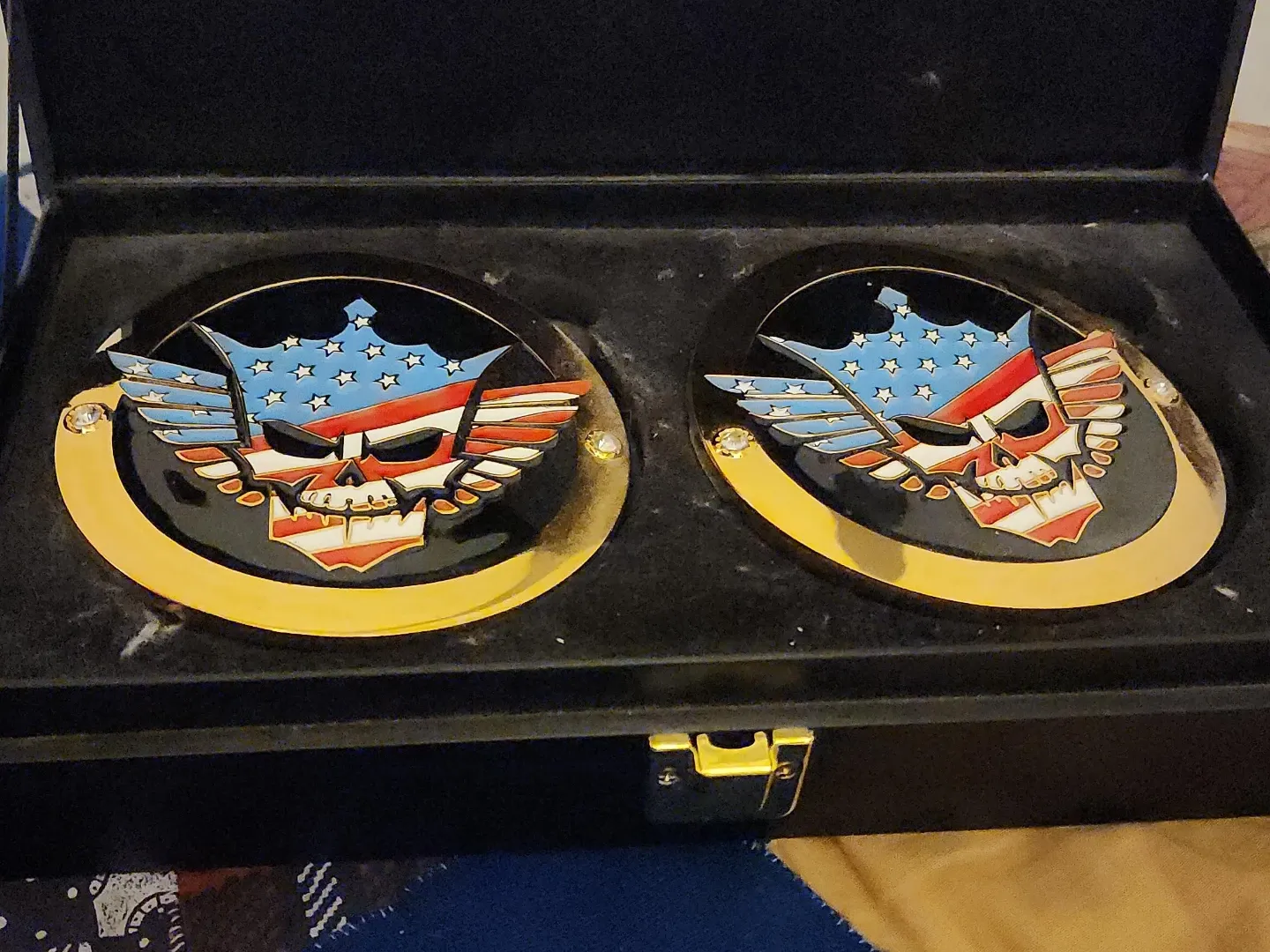 Two championship-style belts featuring a skull with wings design. The design incorporates the American flag colours and stars with a gold-toned outer edge. Includes original presentation box. These collectible belts would appeal to wrestling or memorabilia enthusiasts. don't mind the dust inside the case lol