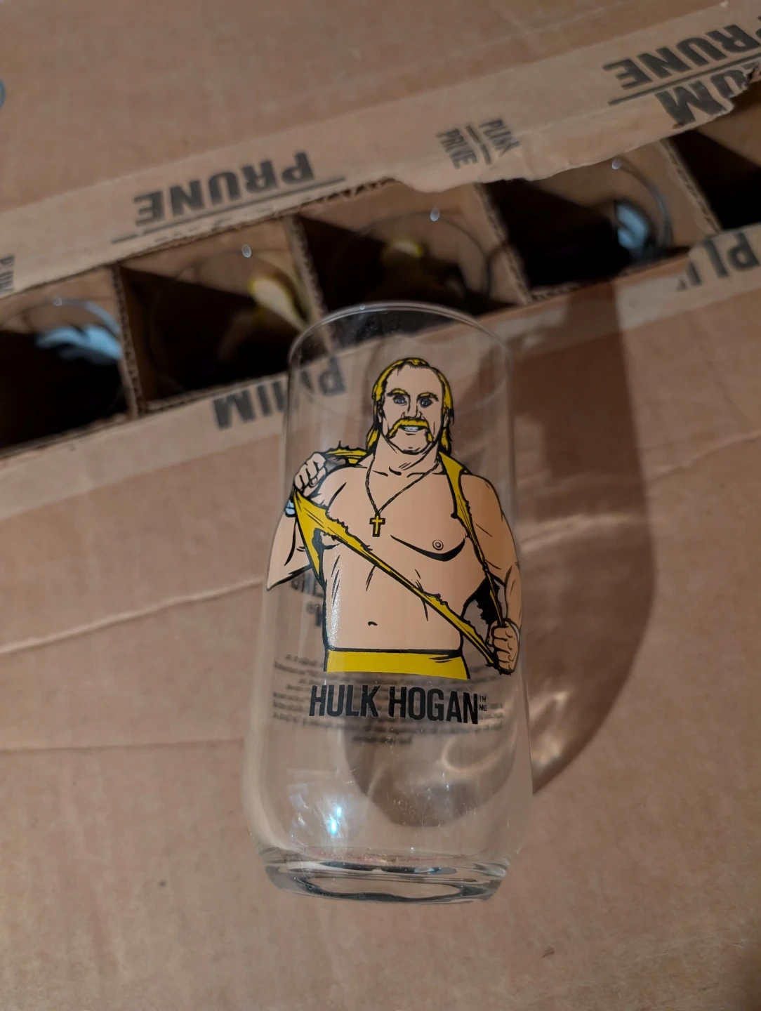 Vintage WWF/WWE glass cups featuring Hulk Hogan. It's made of clear glass with a printed design. This glass is great for collectors or fans of wrestling memorabilia! There are 28 cups.